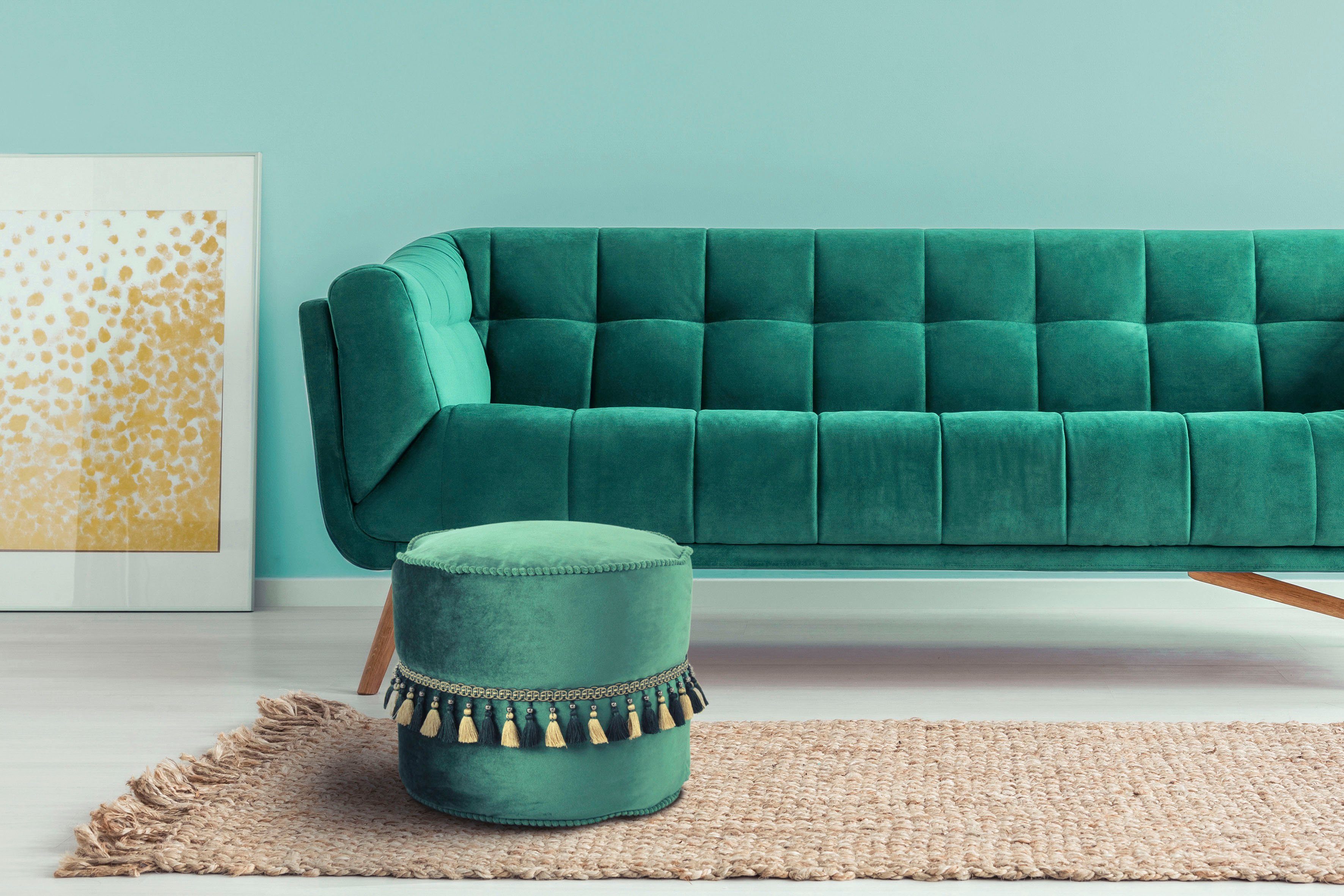 **Orientalischer Sitzhocker** Mit dieser orientalisch angehauchten modernen Sitzgelegenheit peppen Sie jeden Wohnraum gekonnt auf. Das orientalische Design zeichnet sich nicht nur durch die samtige Oberfläche des Hockers, sondern auch durch den farblich abgesetzten Rand und die dekorativen Makramee-Verzierungen aus. Rundum – der Hocker ist ein absoluter Hingucker. Doch nicht nur optisch ist der Hocker ein Schmuckstück. Auch hinsichtlich des Sitzkomfort steht es ihm in nichts nach. Eine flexible, dichte Füllung aus Styroporkugeln sorgt für angenehmen Sitz und dank der Leichtigkeit gleichzeitig für eine problemlose Transportierbarkeit des Möbelstücks. Platzieren Sie den Hocker immer dort, wo Sie ihn gerade benötigen. Die Styroporkugeln sind durch das Außenmaterial geschützt, können jedoch bei Bedarf durch einen Reißverschluss an der Unterseite des Hockers erreicht werden. Der Reißverschluss ist kindersicher, sodass der Hocker nicht versehentlich geöffnet werden kann. Bestellen Sie sich Ihren neuen Sitzpouf und holen Sie sich ein Stück Orient in Ihr Zuhause. Der Pouf kann in seiner tatsächlichen Farbgebung von den Bildern abweichen. Durch unterschiedlichen Lichteinfall und verschiedene Streichrichtungen des Stoffbezuges können unterschiedliche Farbnuancen entstehen.