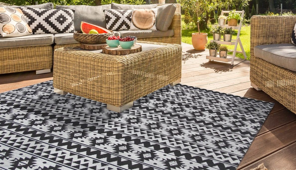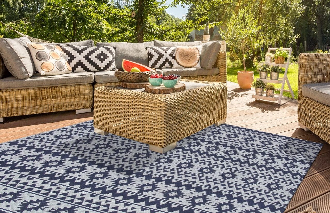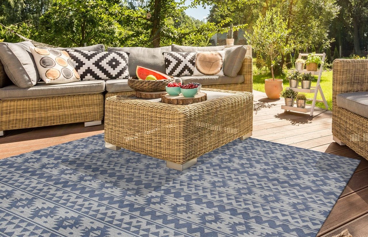 **In- und Outdoor-Teppich in modernem Design** Dieser moderne Teppich kann im Innen- und Außenbereich vielseitig eingesetzt werden. Aus 100 % Polyester wird er in Handarbeit hergestellt und hält durch sein robustes Material jedem Wetter stand. Regen, starke Sonneneinstrahlung oder Wind können dem Teppich nichts anhaben – er behält Form und Farbe lange bei. Verlagern Sie Ihren Wohnbereich im Sommer in den Außenbereich und nehmen Sie Ihren Teppich gleich mit. Mit dem 5 mm hohen Flor verleihen Sie Ihrem Garten, Ihrem Balkon oder Ihrer Terrasse ein ganz besonderes Flair. Doch nicht nur für den Außenbereich ist der Flachflorteppich gut geeignet, denn durch das pflegeleichte Material ist er auch für viel genutzte Räume des Innenbereichs ideal. Ob in Küche, Badezimmer oder Eingangsbereich – der Teppich ist einfach zu reinigen und trocknet schnell. Sogar auf Fußbodenheizungen kann er problemlos genutzt werden. Das Hauptelement des grafischen Musters bilden Dreiecke. Die Symmetrie und die Wiederholungen des Musters wirken charmant und bringen gleichzeitig einen leichten Ethno-Style in ihre Umgebung. Der zweifarbige Teppich ist in verschiedenen Farben erhältlich und lässt sich dadurch mit nahezu jeder Stilrichtung Ihres Innen- oder Außenbereichs kombinieren. Zusätzlich sind verschiedene Größen wählbar, sodass der Teppich für jeden Bedarf verwendet werden kann. Bei dem händisch gefertigten Teppich kann es in Muster, Farben und der Размер zu leichten Abweichungen kommen.