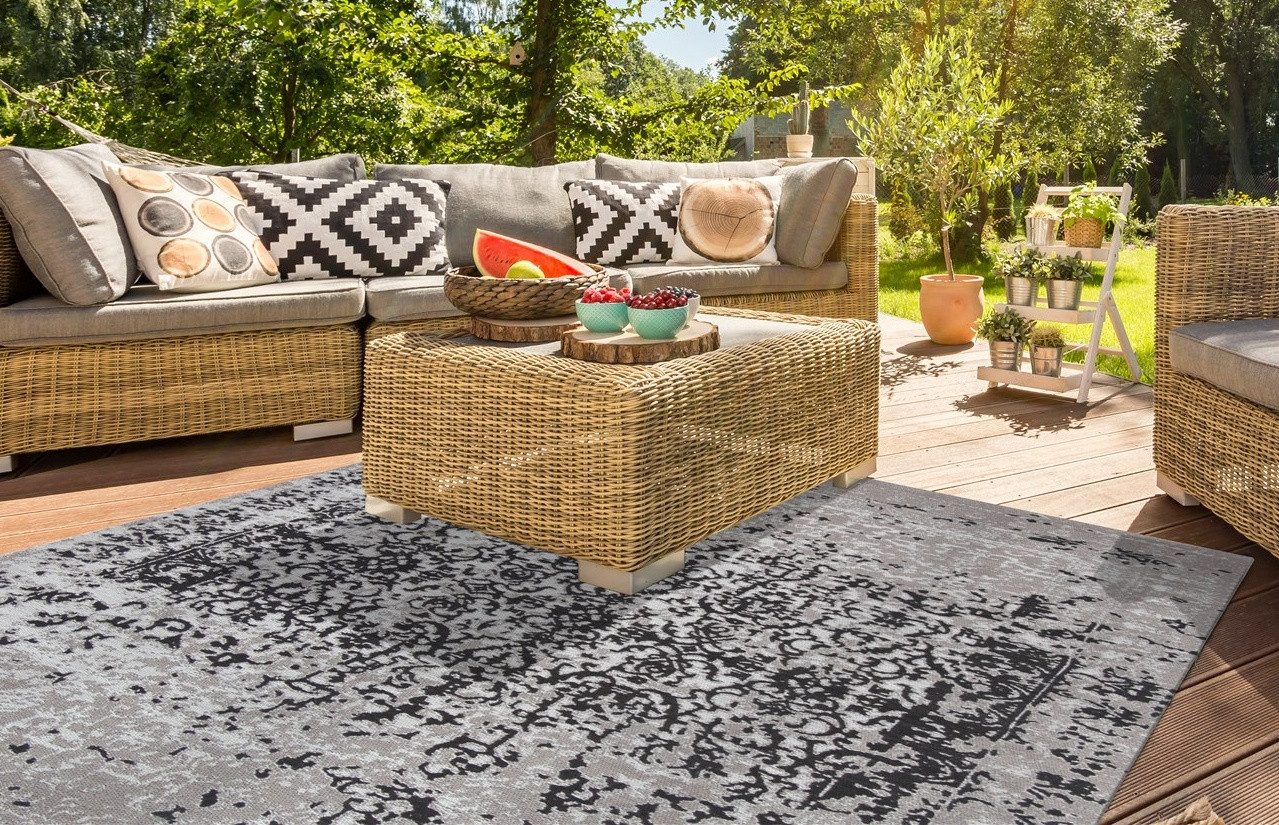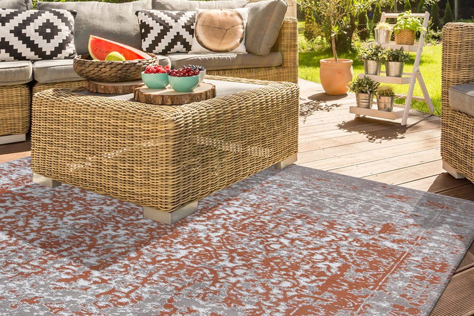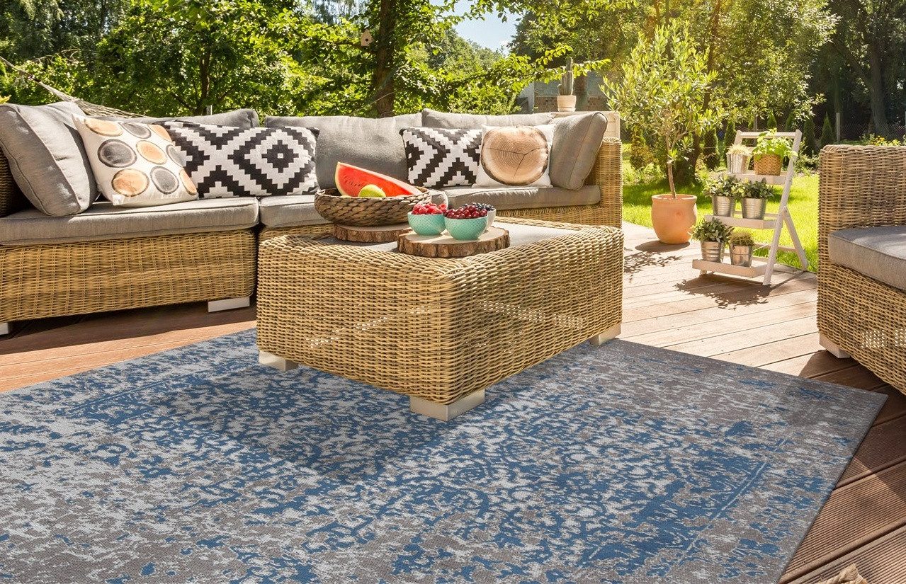 **Teppich in Vintage-Optik für den Innen- und Außenbereich** Dieser Teppich im angesagten Vintage-Design ist sowohl im Innenbereich als auch im Außenbereich nutzbar. Er wurde aus 100 % Polyester gefertigt, was ihn besonders strapazierfähig und stabil macht. Im Innenbereich ist er daher besonders für viel genutzte Räume, wie die Küche, den Flur oder das Badezimmer geeignet und sogar mit Fußbodenheizungen nutzbar. Doch vor allem auch im Außenbereich gibt der flachflorige Teppich ein gutes Bild. Die Vintage-Optik kommt in Kombination mit den natürlichen Farben des Außenbereichs besonders gut zur Geltung und bringt ein Stück Wohnlichkeit in Ihren Garten oder auf Ihren Balkon. Das licht- und farbechte Material nimmt wenig Feuchtigkeit auf, trocknet schnell und trotzt somit jeglichen Wetterfronten. Auch in der Pflege und Reinigung ist der Teppich sehr einfach zu handhaben. Wählen Sie aus verschiedenen Farben und Größen den für Sie passenden Teppich und platzieren Sie ihn in Ihrem Innen- oder Außenbereich. Da der Teppich in Handarbeit hergestellt wurde, können Muster, Farbe und Размер leicht von den Abbildungen und Beschreibungen abweichen.