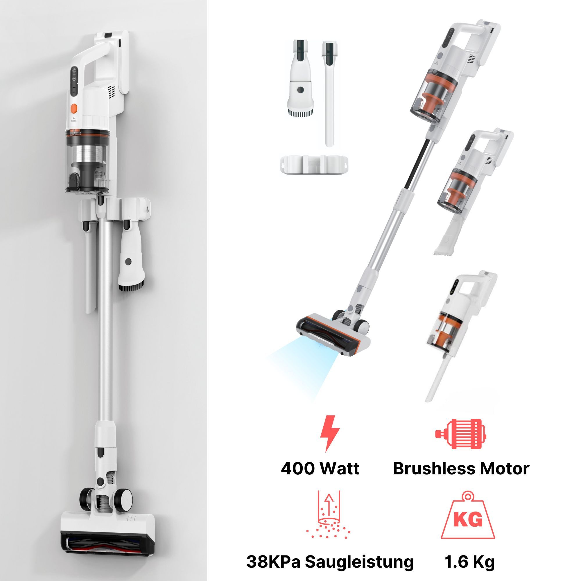 Der KB-ELEMENTS kabellose Staubsauger bietet eine 6-stufige hocheffiziente Filtration für saubere Luft in Ihrem Zuhause. Mit einem 400 Watt bürstenlosen Motor und einer beeindruckenden Saugleistung von 38 Kpa sorgt er für eine gründliche Reinigung. Ausgestattet mit LED-Beleuchtung und einem 2500 mAh Lithium-Akku bietet er eine Betriebszeit von bis zu 35 Minuten. Dank zwei Leistungsstufen (Eco und Max) können Sie die Saugleistung anpassen, während das leichte Design von nur 1,6 kg ihn besonders handlich macht.