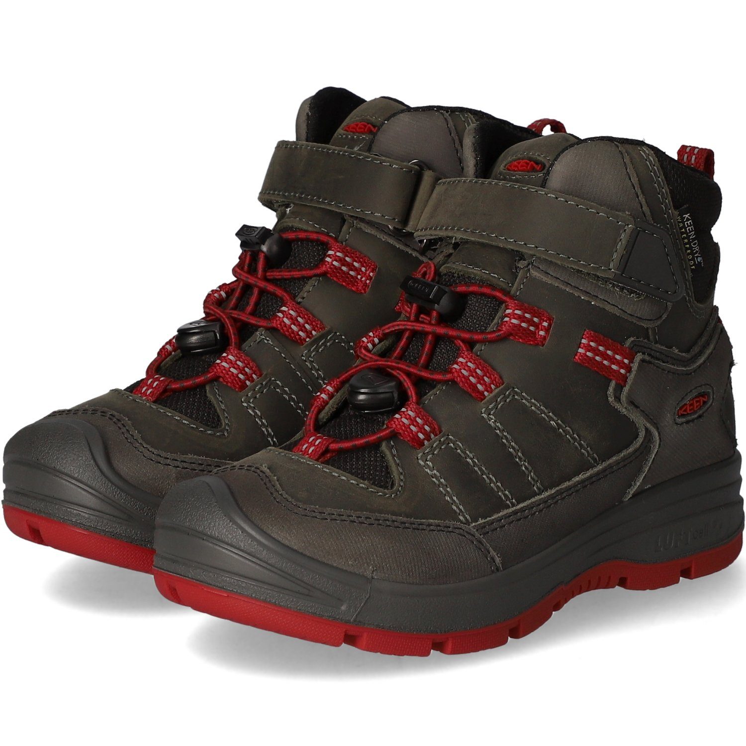 Keen Kinder Stiefeletten REDWOOD Grau/Grün Leder-Textil-Mix - Klettverschluss und Elastikband mit Schnellverschluss - kleine Details in rot - Ziernähte - Anziehlasche - verstärkter Zehen- und Fersenbereich - gepolstertes Wechselfußbett - flexible, rutschhemmende Laufsohle mit Profil - KEEN-DRY (wasserfest)