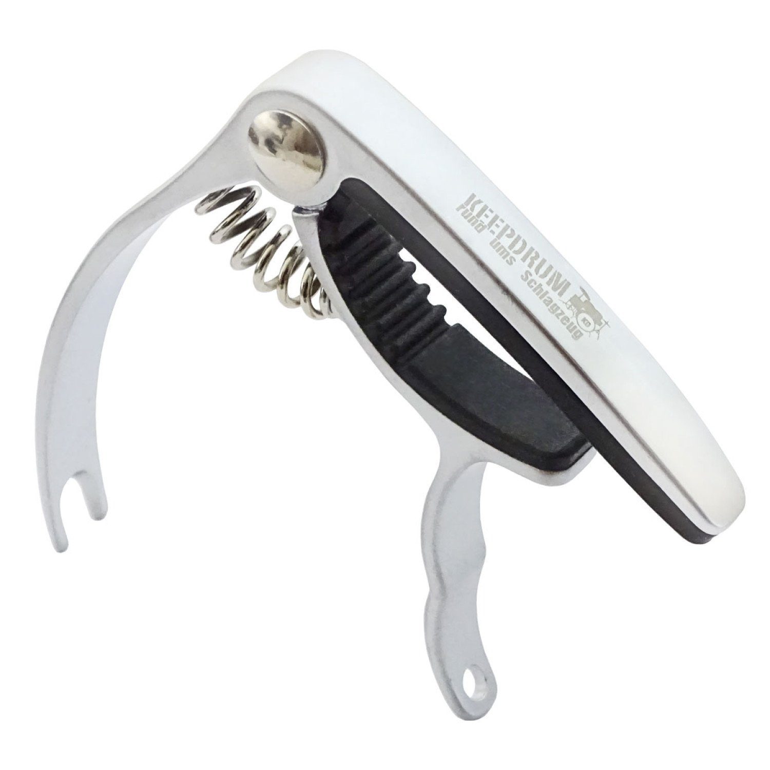 Der keepdrum Gitarren-Kapodaster eignet sich für E-Gitarren, sowie für Western- und Konzertgitarren. Der kräftige Federmechanismus sorgt für den optimalen Druck auf die Saiten und liefert dadurch einen sauberen, klaren Ton ohne Schnarren. Durch das ergonomische Design kann der Capo mit nur zwei Fingern bequem geöffnet und befestigt werden. Schnelles und unkompliziertes Transponieren der Tonhöhe ist somit kein Problem.