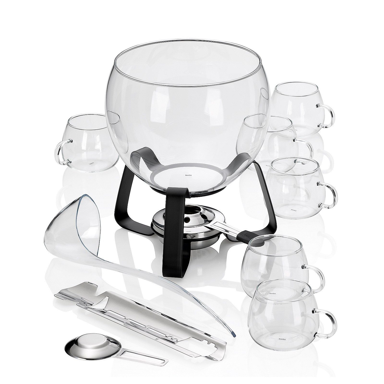 Bei diesem Set sind die bauchigen Trinkgläser wie auch der Bowlentopf aus feuerfestem Borosilikat-Glas gefertigt, die Zuckerzange und der Sicherheitspastenbrenner aus hochwertigem Edelstahl, das Rechaud aus Metall in schwarz-matter Optik und die Schöpfkelle zum Befüllen der Gläser aus Acryl.