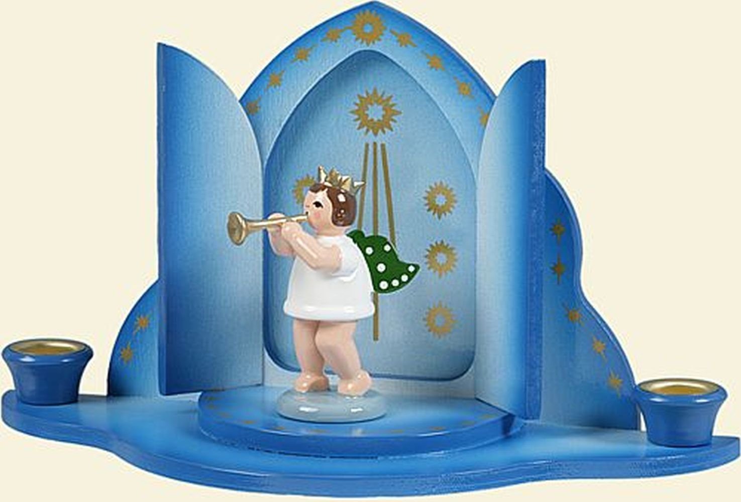 Kerzenhalter Engel am Himmelstor weiß ohne Krone Machen Sie noch mehr aus Ihrer Tischdeko mit diesem Kerzenhalter. Der niedliche Engel steht vor dem Himmelstor und hält in den Händen ein Instrument. Der Engel ist 6 cm groß und farbig gestaltet. Der Kerzenhalter besitzt links und rechts eine Metalltülle für Pyramidenkerzen und wird in verschiedenen Schritten komplett aus Holz im Erzgebirge gefertigt Höhe 6cm NEU |