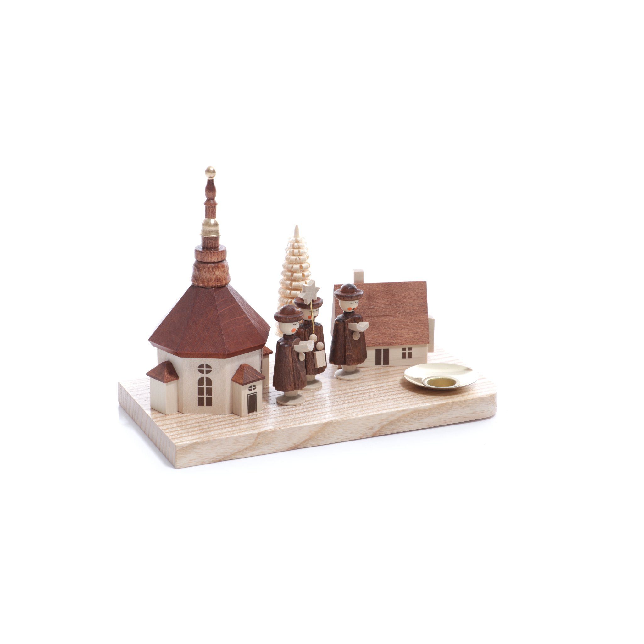 Kerzenhalter Kurrende Mit diesem schönen Kerzenhalter holen Sie sich ein Stück Erzgebirge in Ihre Wohnung. Der Sockel ist bestückt mit 3 Figuren die sehr filigran verarbeitet, und in einem Braunton gehalten sind. Hinter der Kurrende steh ein Ringelbaum sowie 1 Haus und die Kirche von Seiffen. Ein Sänger hält in den Händen einen Stern und eine Laterne, die anderen jeweils das Gesangsbuch. Auf dem Sockel ist ein Messingtüllen versenkt in die die Kerzen gestellt werden kann. Er wird in verschiedenen Arbeitsschritten komplett in Seiffen in einem kleinen Familienbetrieb gefertigt. Die Figuren haben eine Höhe von 10cm. BxHxT ca 18x12x9 cm NEU |