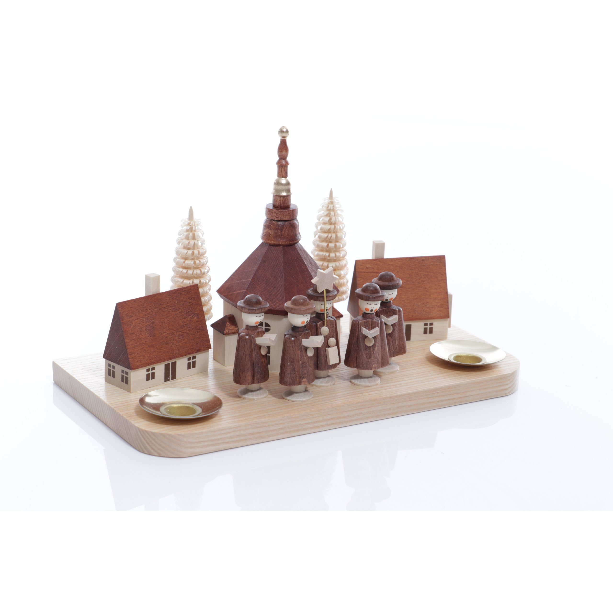 Kerzenhalter Kurrende Mit diesem schönen Kerzenhalter holen Sie sich ein Stück Erzgebirge in Ihre Wohnung. Der Sockel ist bestückt mit 5 Figuren die sehr filigran verarbeitet, und in einem Braunton gehalten sind. Hinter der Kurrende stehen Ringelbäume sowie 2 Häuser und die Kirche von Seiffen. Ein Sänger hält in den Händen einen Stern und eine Laterne, die anderen jeweils das Gesangsbuch. Auf dem Sockel sind 2 Messingtüllen versenkt in die die Kerzen gestellt werden kann. Er wird in verschiedenen Arbeitsschritten komplett in Seiffen in einem kleinen Familienbetrieb gefertigt. Die Figuren haben eine Höhe von 10cm. Höhe ca 13 cm NEU |