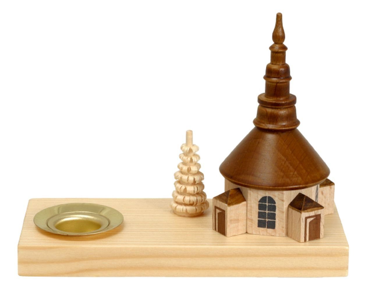 Kerzenhalter mit Kirche Dieser tolle Sockel ist komplett aus Holz gefertigt. Machen Sie noch mehr aus Ihrer Tischdeko zum Beispiel mit einer schönen Kerzenhalter. Bestückt ist er mit der Seiffen Kirche und einem Ringelbaum. In die Tülle passen normale Pyramidenkerzen. Der gesamte Sockel ist natur und wird in verschiedenen Schritten komplett in Seiffen in einem kleinen Familienbetrieb gefertigt BxHxT 100x80x45mm NEU |