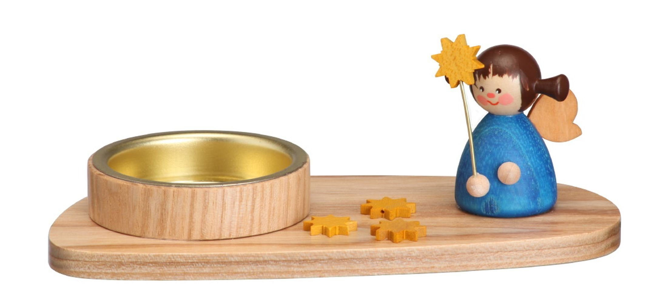 Teelichthalter Engel mit Stern blau Machen Sie noch mehr aus Ihrer Tischdeko zum Beispiel mit einem schönen Kerzenhalter. Bestückt ist er mit einem kleinen blauen Engelchen mit Stern. In die Tülle passen normale Teelichtkerzen. Der gesamte Sockel ist aus Holz und wird in verschiedenen Schritten komplett in Seiffen in einem kleinen Familienbetrieb gefertigt BxHxT 13x4,5x5,5cm NEU |