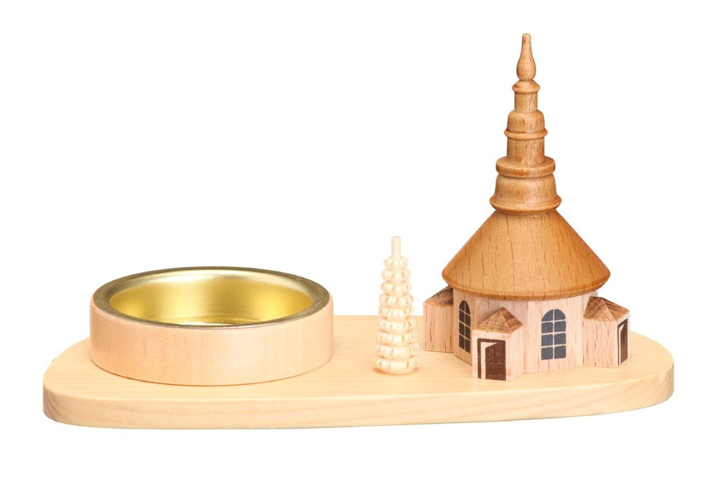 Teelichthalter Kirche natur Machen Sie noch mehr aus Ihrer Tischdeko zum Beispiel mit einem schönen Kerzenhalter. Bestückt ist er mit der Seiffen Kirche und einem Ringelbaum. In die Tülle passen normale Teelichtkerzen. Der gesamte Sockel ist aus Holz, natur belassen und wird in verschiedenen Schritten komplett in Seiffen in einem kleinen Familienbetrieb gefertigt BxHxT 16x7x5,5cm NEU |