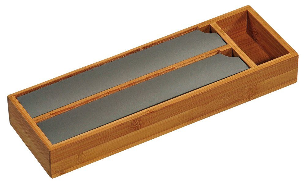 Der Lebensmittelfolienspender von Kesper ist mit zwei Fächern ausgestattet, die eine praktische Funktion des Lebensmittelfolienschneiders und einer zusätzlichen Trennwand für Kleinteile wie Clips, Gummibänder usw. haben. Der Schubladeneinsatz ist aus Bambus, ideal für die Küche und sieht gut aus.