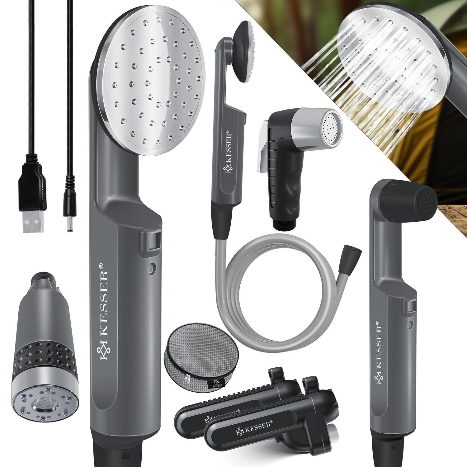 Mit einem Haken und einem Saugnapf können Sie diese Dusche irgendwo aufhängen.Den Duschkopf können Sie mit einem Saugnapf an der Außenwand Ihres Fahrzeugs platzieren oder über einen Doppelhaken mit Aufhängung am Wohnwagen, einem Ast, einer Leine, dem Auto uvm., befestigen.