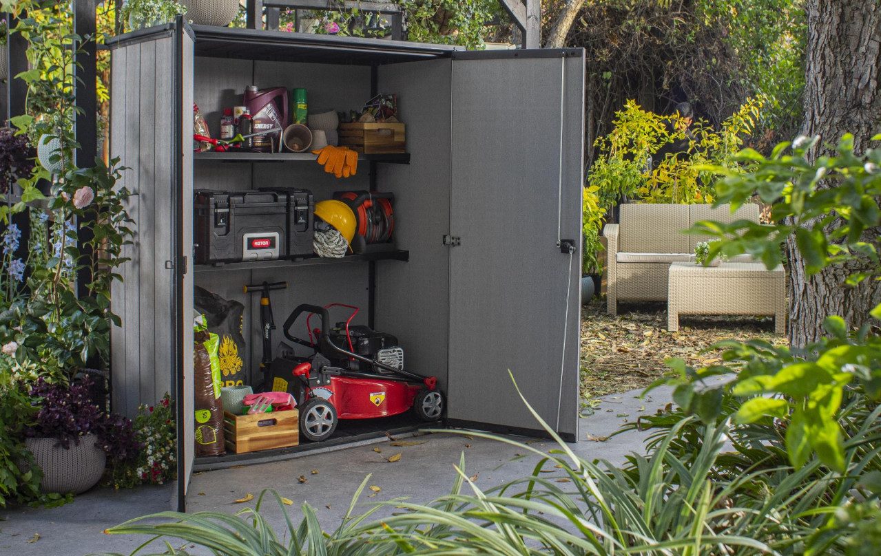 Aus hochwertigem DUOTECH Material besticht vor allem durch seine natürliche, raue Holzoptik. Das speziell entwickelte DOUTECH Material verbindet Holz-Ästhetik mit einer hohen Beständigkeit vor wetter- und UV-Einflüssen und ist damit nicht nur langlebiger, sondern auch wartungsarmer als ein Naturholzprodukt. Durch das zeitlose Design wird der High Store+ zum Blickfang in jedem Garten. Wer jedoch den Aufbewahrungsschrank farblich individuell verändern möchte, kann es problemlos in seiner Wunschfarbe anstreichen. So bietet es Gestaltungsfreiraum für jeden Geschmack. Der Aufbewahrungsschrank mit seinem Nutzinhalt von 1.400 Litern ist hervorragend zur Aufbewahrung von vielen Gartenutensilien geeignet. Durch zwei große Türen erfolgt ein einfacher Zugang zum geräumigen Inneren der Box. Es befinden sich zwei höhenverstellbare Regalbretter im Lieferumfang (max .Tragkraft je Regalbrett ca. 16kg), wodurch eine vereinfachte Organisation und Ordnung des Inhalts ermöglicht werden. Nach der einfachen Montage der Nut- und Feder-Paneele ist der Schrank bruchsicher und die hochwertige Verarbeitung ermöglicht eine langlebige Platzierung im Außenbereich.