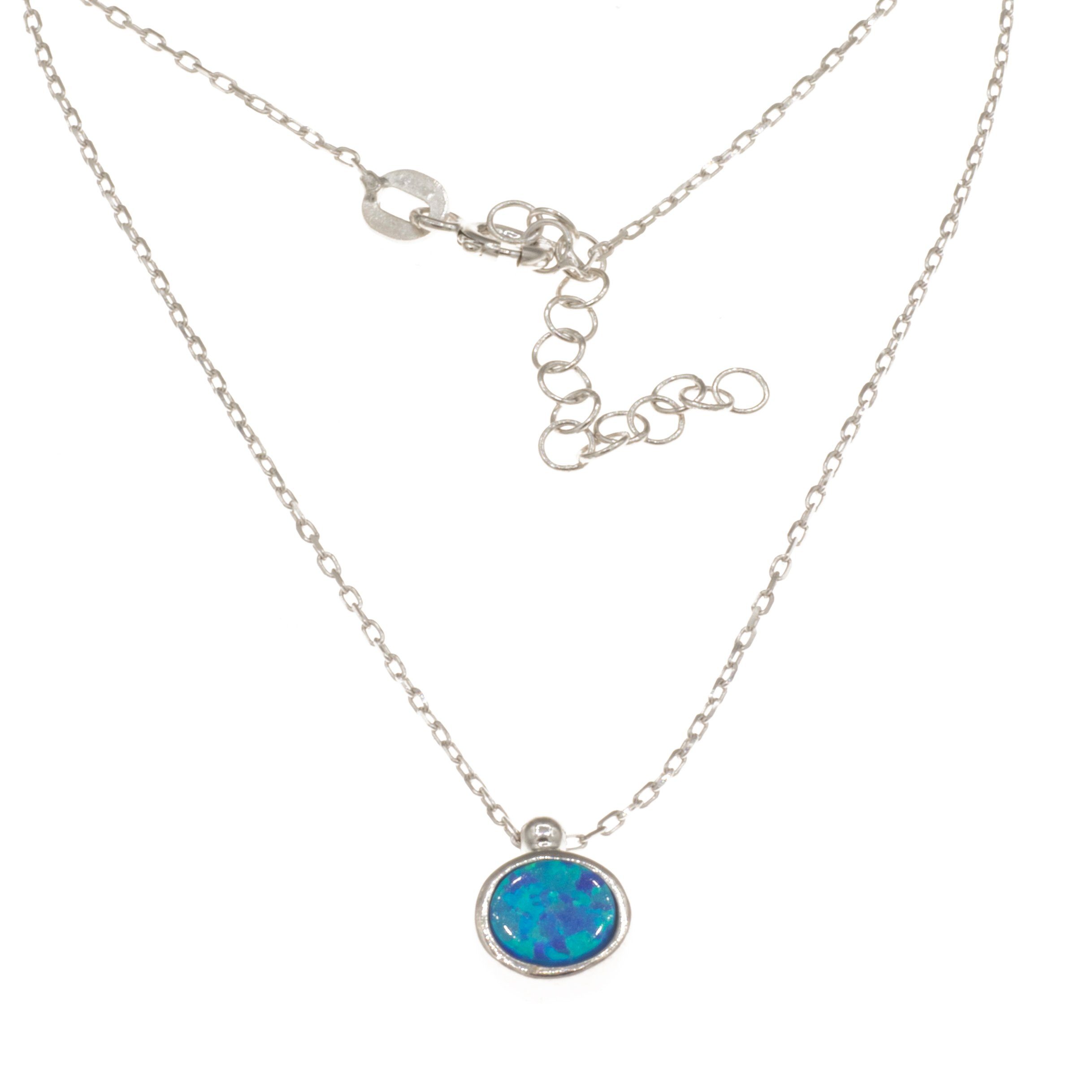 Anhänger aus synthetisch hergestelltem Opal bläulich schimmernd mit einer fest verbundenen Kette. Beides aus 925 Sterling Silber, Durchmesser des Anhängers 7,5 mm. Die Kette lässt sich von 42 - 45 cm tragen.