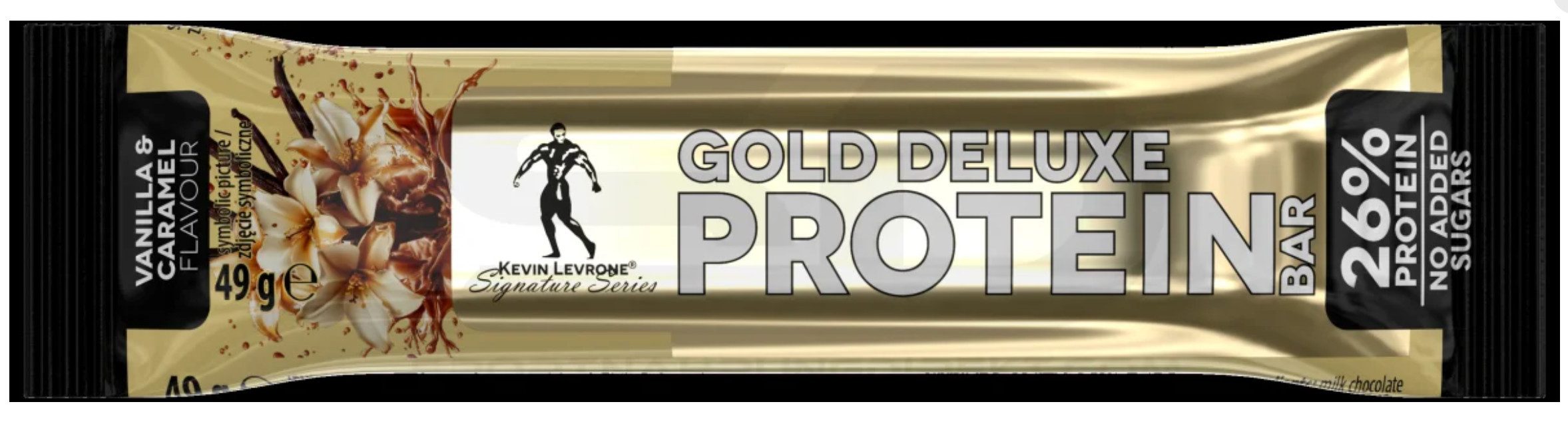 GOLD DeLuxe Proteinriegel. Ein Proteinriegel mit Milchschokoladeüberzug ohne Zuckerzusatz und einer Vanille-Karamell-Füllung. Enthält Süßstoff.