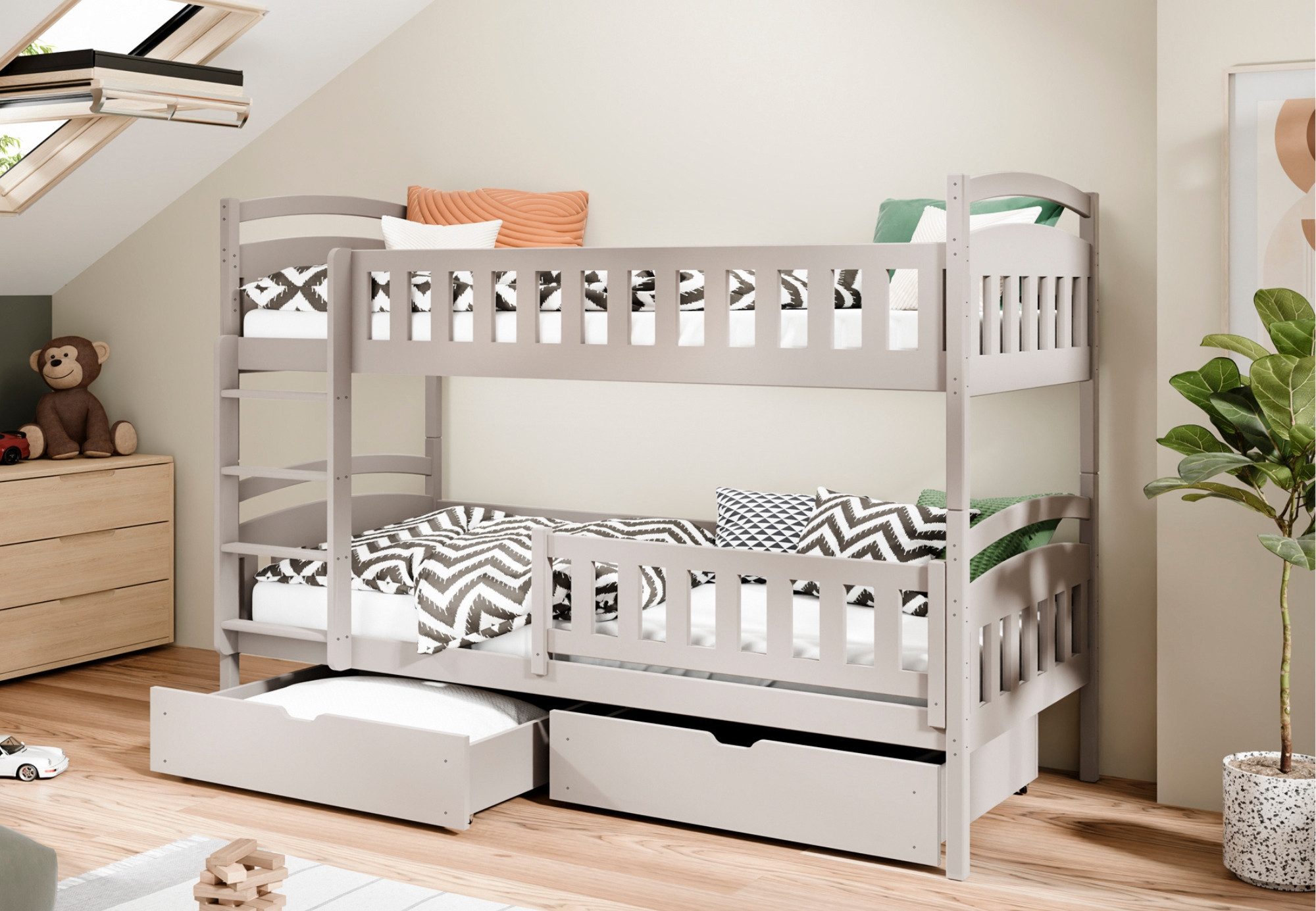 Das Bett misst 97x208x164 cm (BxTxH) und ist für Matratzen der Размер 90x200 cm geeignet. Zwei integrierte Schubladen aus MDF bieten praktischen Stauraum für Decken, Kissen oder Spielzeug. Die stabile Leiter ermöglicht einen sicheren Aufstieg zur oberen Liegefläche, während die robuste Holzstruktur für eine lange Lebensdauer sorgt.