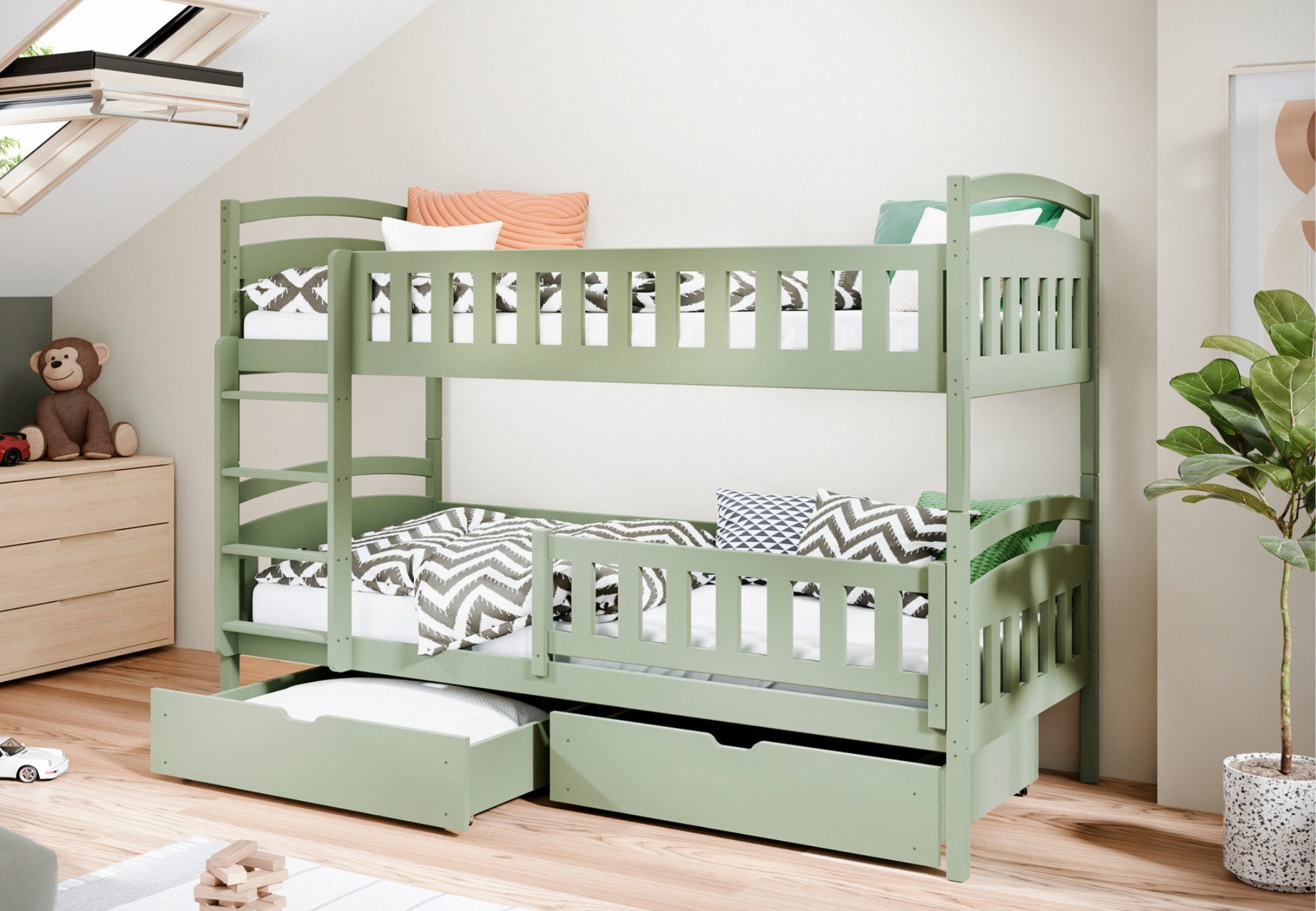 Ausstattung | Etagenbett mit Rausfallschutz und zwei Schubladen |