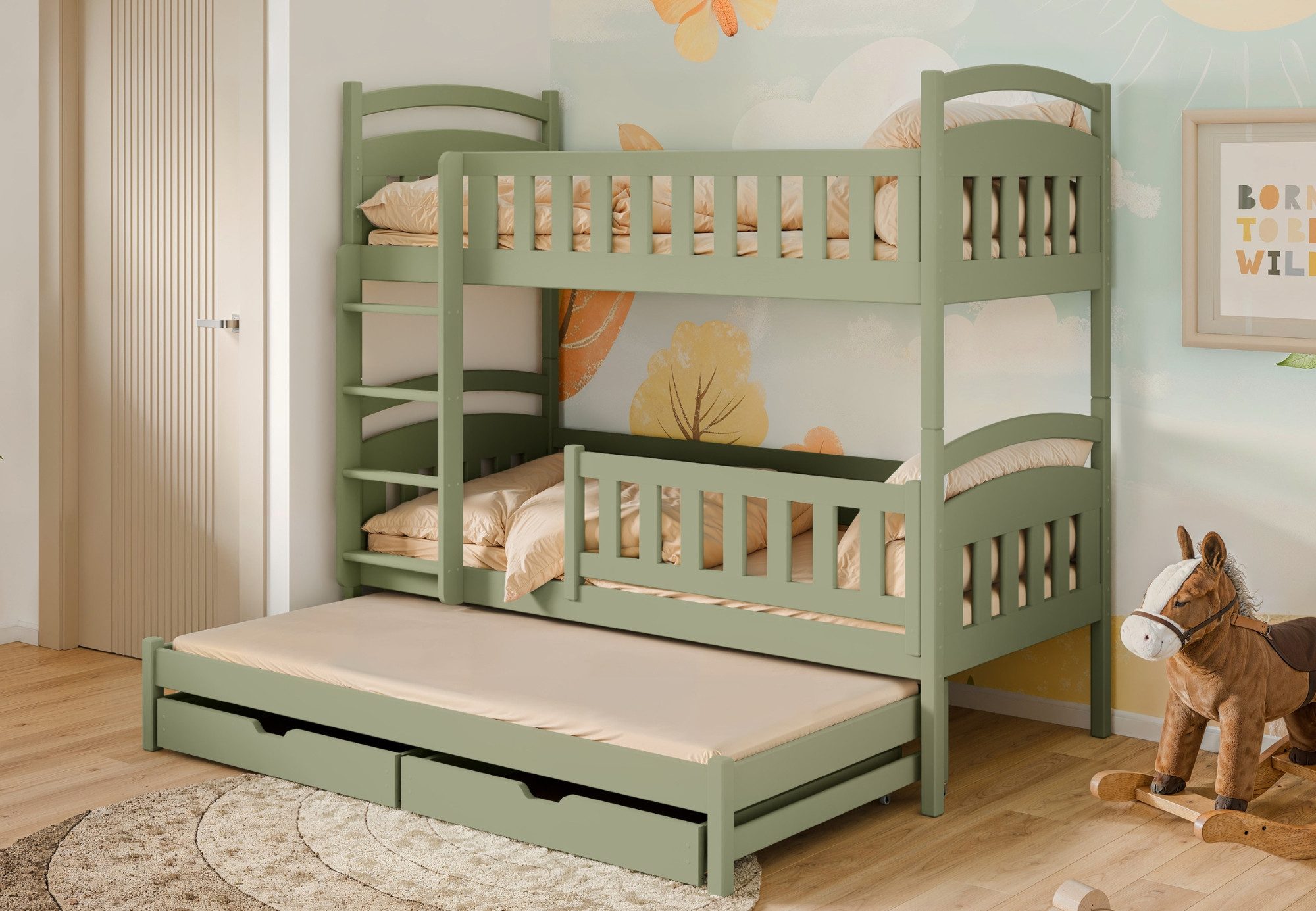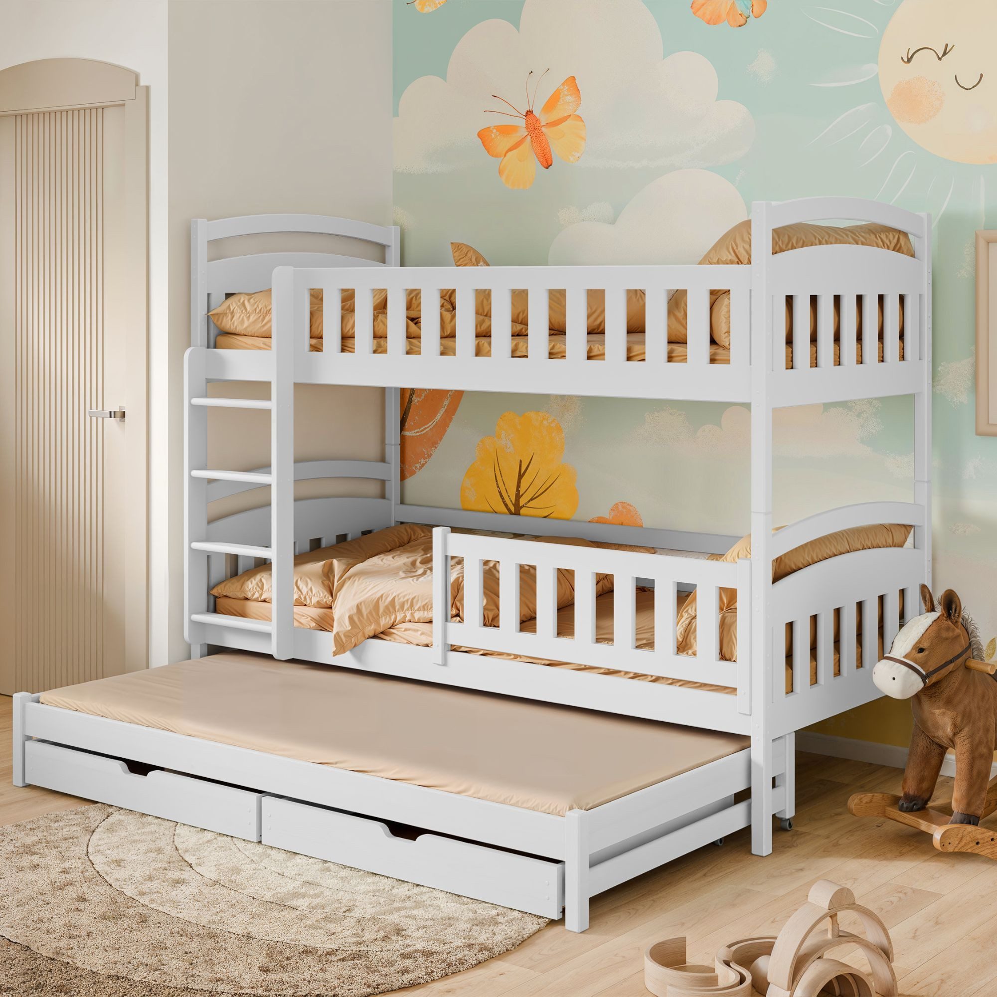 Für Sicherheit sorgt ein fester Rausfallschutz am oberen Bett. Die beiden unteren Betten sind mit abnehmbaren, steckbaren Rausfallschutzen ausgestattet, die je nach Bedarf eingesetzt oder entfernt werden können.