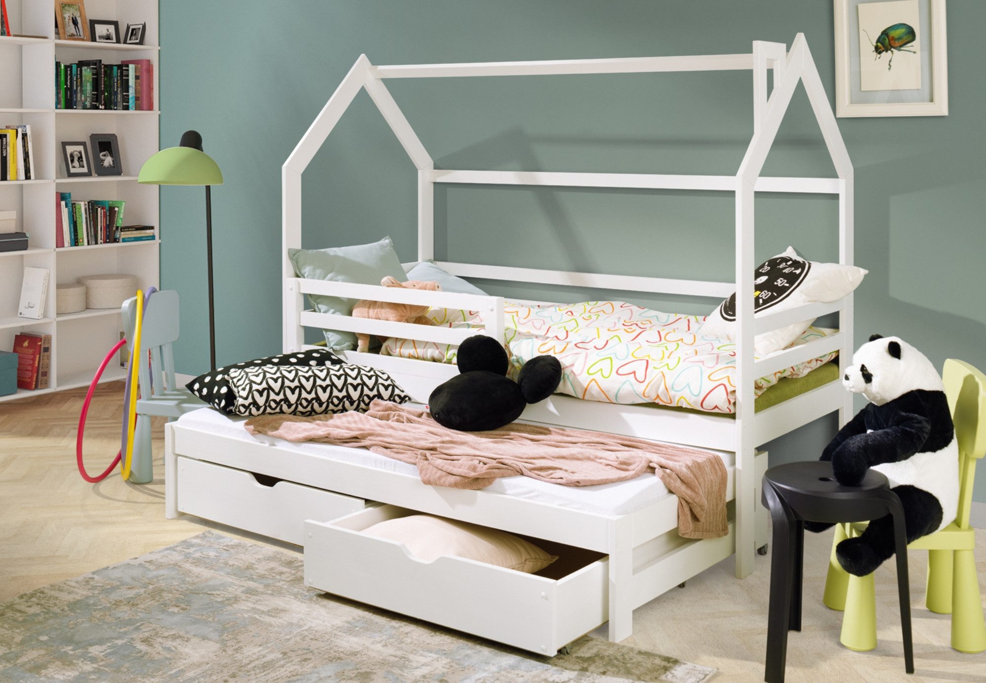 Verwandeln Sie das Kinderzimmer in einen magischen Ort mit unserem Hausbett mit Ausziehbett. Dieses vielseitige Möbelstück bietet nicht nur eine sichere Schlafumgebung, sondern auch ein attraktives, modernes Design, das sowohl für Jungen als auch für Mädchen geeignet ist. Aus langlebigen Materialien gefertigt, garantiert es eine lange Lebensdauer und Sicherheit. Der Rahmen aus Birken-Holz bietet hervorragenden Halt für jede Matratze und fördert einen erholsamen Schlaf.