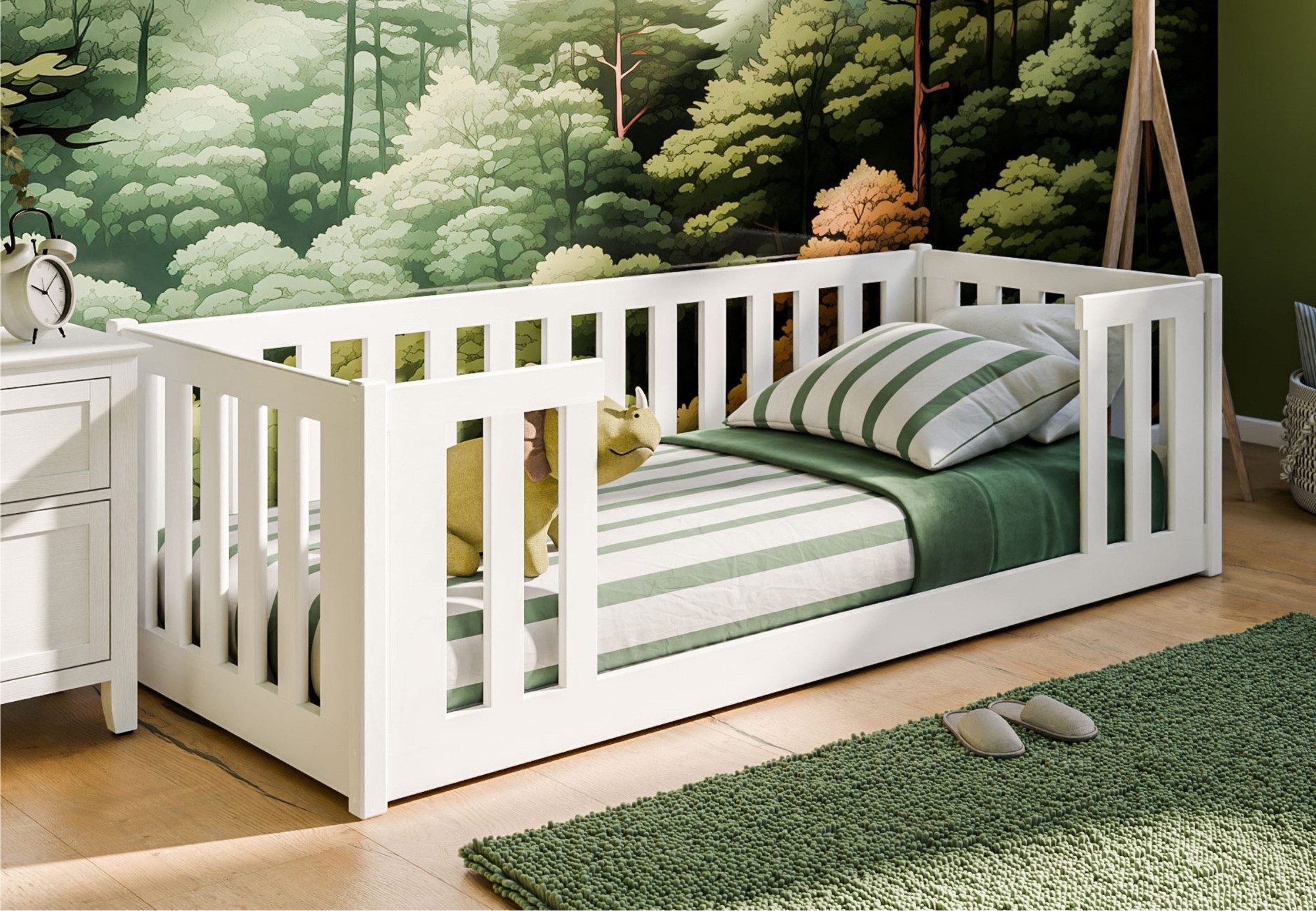 Mit Blick auf die Sicherheit und den Komfort Ihres Kindes konzipiert, verfügt das Bett über ein bodennahes Design und robuste Sprossen, was es zu einer sicheren Wahl für junge Schläfer macht. Seine Abmessungen von 90x200 cm bieten reichlich Platz für einen erholsamen Schlaf in allen Phasen der Kindheit. Das elegante weiße Finish des Bettes fügt nicht nur einen Hauch von Raffinesse hinzu, sondern bietet auch Vielseitigkeit bei der Abstimmung mit verschiedenen Raumdekoren.