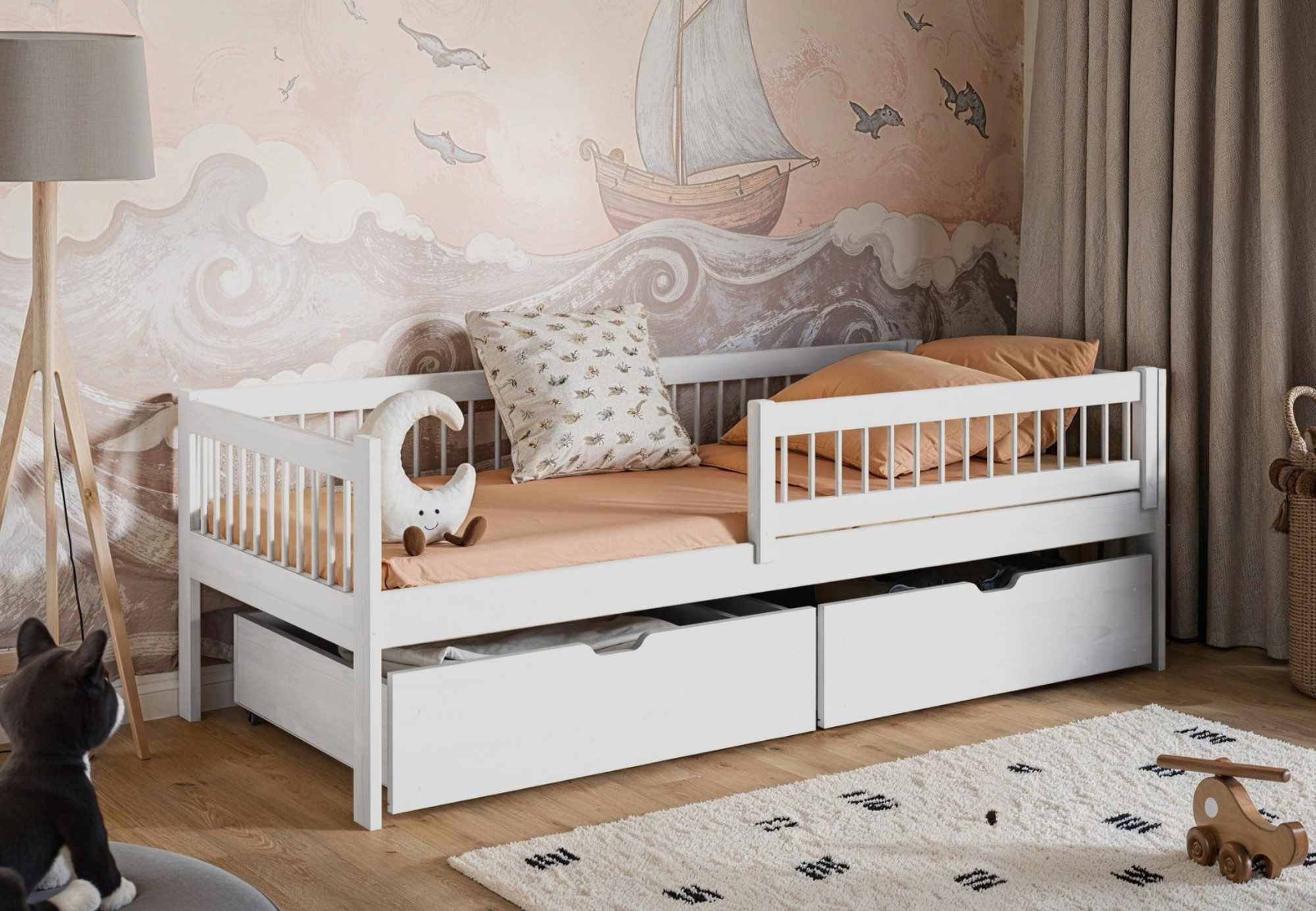 Besonders praktisch sind die zwei geräumigen Schubladen unter dem Bett, die für zusätzlichen Stauraum sorgen – ideal für Bettwäsche, Kleidung, Kuscheltiere oder Spielzeug. Damit bleibt das Kinderzimmer ordentlich, ohne dass weitere Möbelstücke nötig sind.