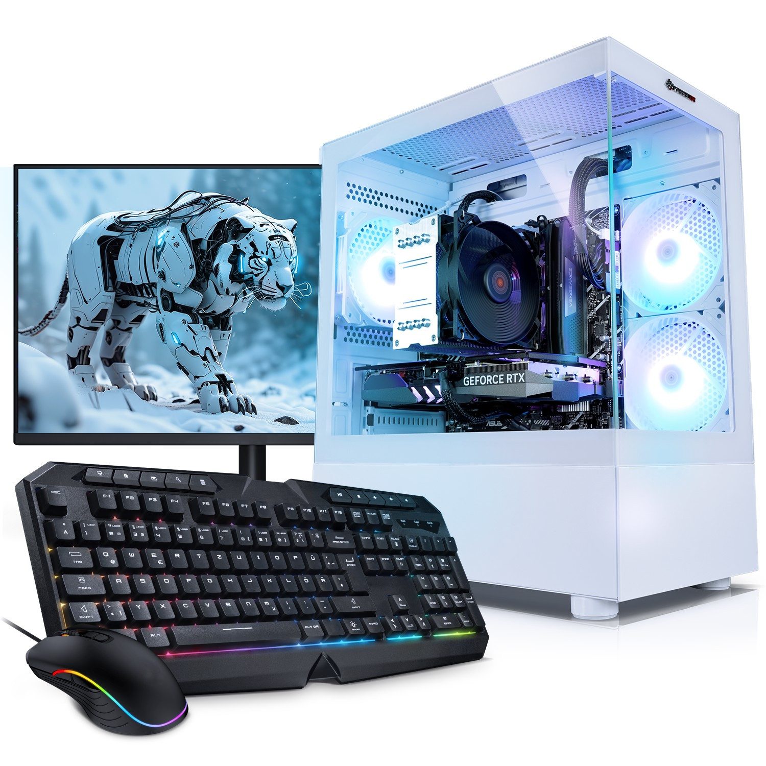 Das optische Highlight strahlt durch hochwertige Glasscheiben (kratzfest) in jeder gewünschten Farbeinstellung. Eine überzeugende Ausstattung mit schneller SSD Systemplatte, viel Arbeitsspeicher, starker AMD Ryzen Multicore Prozessor und alle gängigen Anschlüsse wie USB3 / HDMI / Netzwerk / Wireless-LAN. Das komplette Set aus Gamer-PC, großem 27 Zoll (68cm) TFT-Monitor und Gaming Maus + Tastatur lässt kaum Wünsche offen.