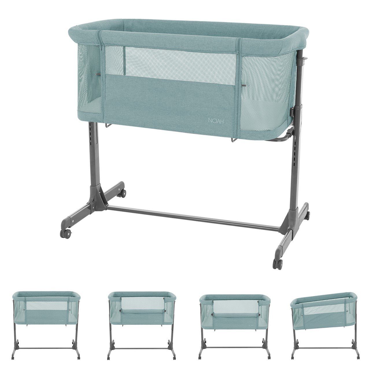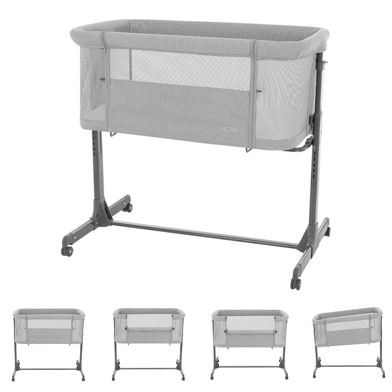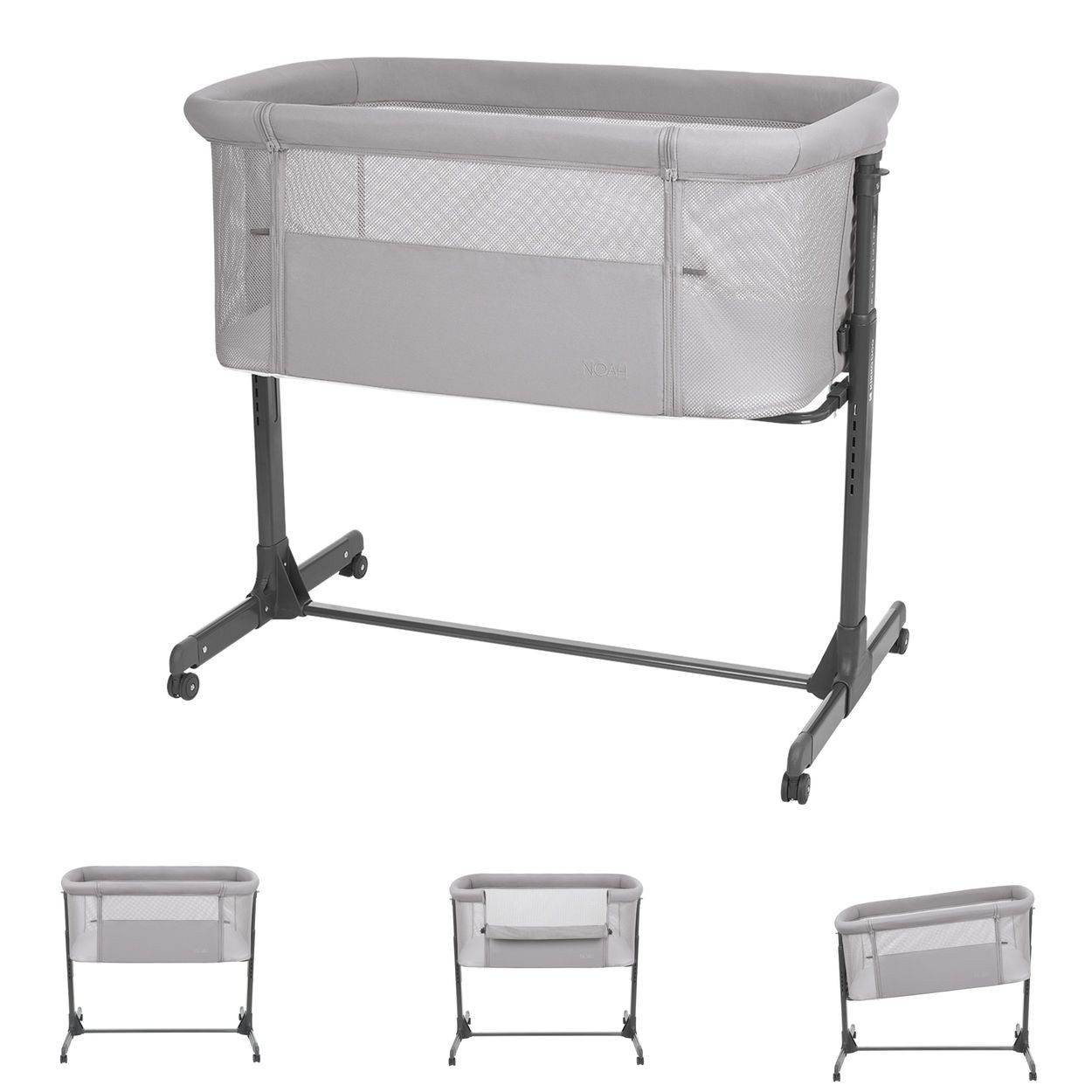 Mit dem Beistellbett Noah von Kikkaboo schläft Ihr Baby sicher im eigenen Bettchen und ist trotzdem in Ihrer Nähe. Die Vorderseite lässt sich absenken, sodass Sie jederzeit direkten Zugriff auf Ihr Baby haben. Das Beistellbett lässt sich mit Hilfe des Gurtes problemlos am Erwachsenenbett fixieren. Das Babybett ist 6-fach in der Höhe verstellbar und mit Netzeinsätzen versehen, die für eine optimale Luftzirkulation sorgen. Die Anti-Reflux-Position verhindert den Rückfluss der Magensäure in die Speiseröhre und bietet Ihrem Kind mehr Sicherheit beim Schlafen. Zum einfachen Bewegen des Bettes sind 4 Räder angebracht. So können Sie das Beistellbett vom Schlafzimmer ins Babyzimmer bringen, ohne es tragen zu müssen. Mit diesem Bettchen haben Sie einen sicheren Schlafplatz für Ihr Baby ab Geburt bis zu einem Maximalgewicht von 9 Kilogramm.