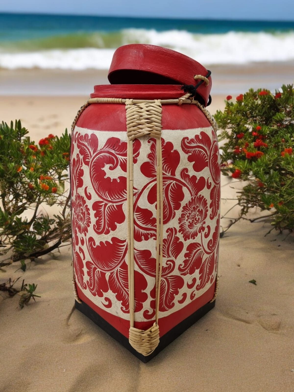 Mit großzügigen Maßen von ca. 60 x 30 x 30 cm bietet dieser handbemalte Reiskorb ausreichend Platz für die Aufbewahrung von trockenen Lebensmitteln wie Reis und Nudeln, kann aber auch zum Beispiel als Schirmständer oder ausgefallener Blumenübertopf genutzt werden. Der praktische Deckel sorgt dafür, dass der Inhalt geschützt und frisch bleibt, während das handbemalte Design dem Korb einen unverwechselbaren Charme verleiht.