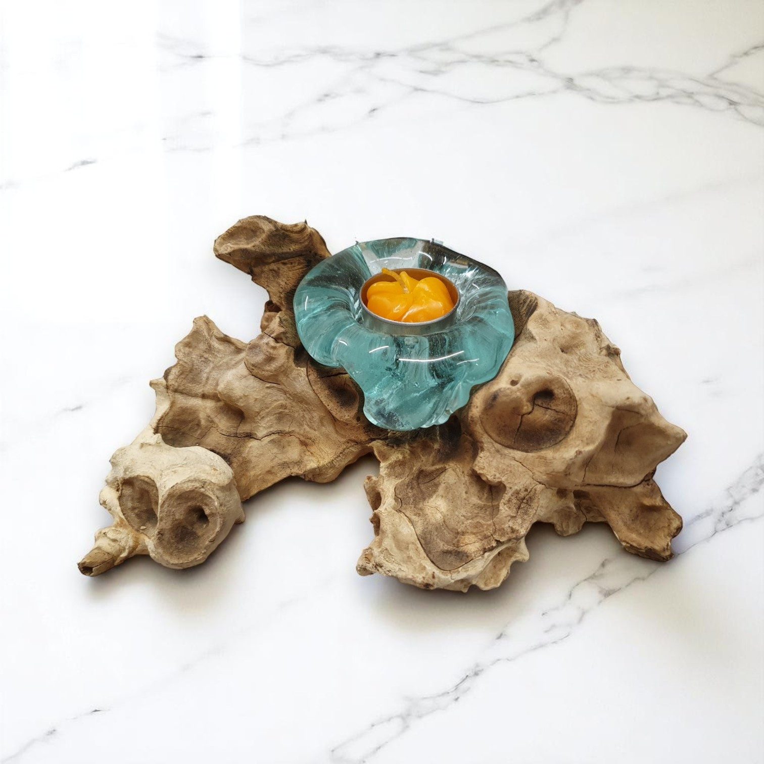 Lieferumfang | 1x Geschmolzenes Glas auf Wurzelholz Teelichthalter nach Auswahl |
