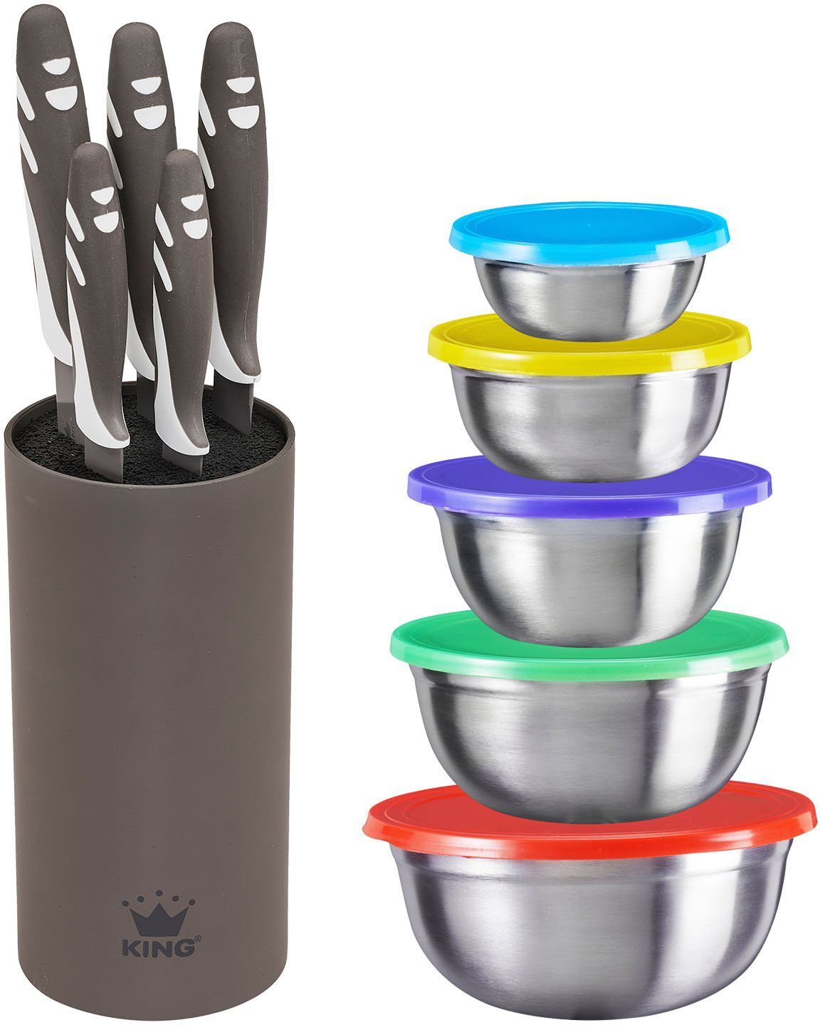 Das 5-teilige Schüsselset FUNNY von KING ist besonders praktisch: 5 Edelstahl-Schüsseln in den Größen ca. Ø12cm, Ø14cm, Ø16cm, Ø18cm und Ø20cm sorgen dafür, dass alles perfekt aufgehoben ist: Salate, Knaberreien etc. Die Schlüsseln sind aus Edelstahl, die Deckel aus Kunststoff.