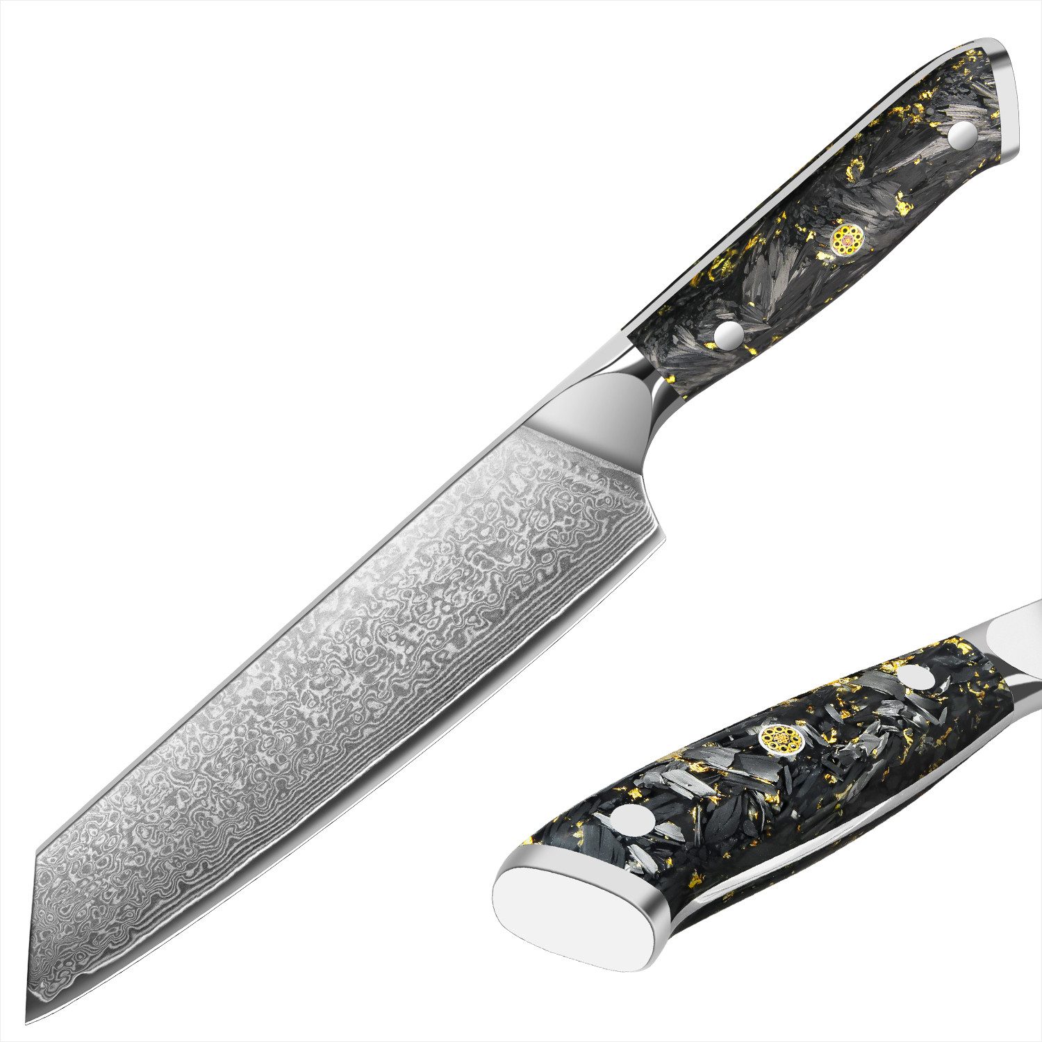 Die professionellen Fleischmesser sind mit einem Griff aus Harz, zerkleinertem Kohlenstoff und Blattgold ausgestattet und mit 3 Nieten für gute Balance und Qualität befestigt. Das ergonomische Design des Griffs verbessert die Kontrolle, den Komfort und die Effizienz beim Schneiden erheblich. Auch nach längerem Gebrauch ermüden Handfläche und Handgelenk nicht.
