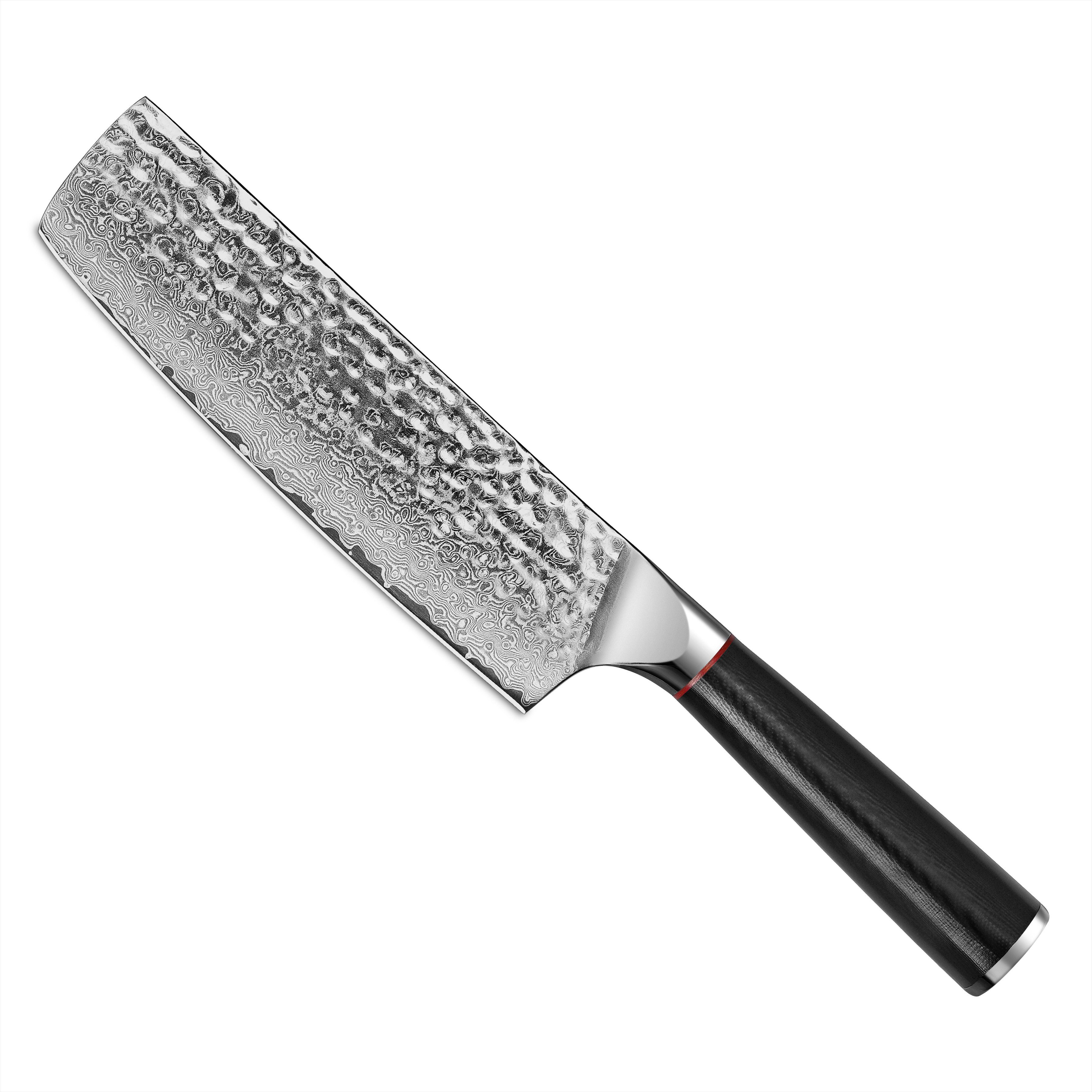 Mit dem VG-10-Kern ist die Klinge unglaublich stark und stabil. Hochleistungsfähiger, gegossener 67-lagiger Damaszenerstahl mit einer 2 mm Klinge und die Kanten sind mit 15 Grad pro Seite geschärft., die die Kanten scharf hält und gegen Flecken und Rost resistent ist.