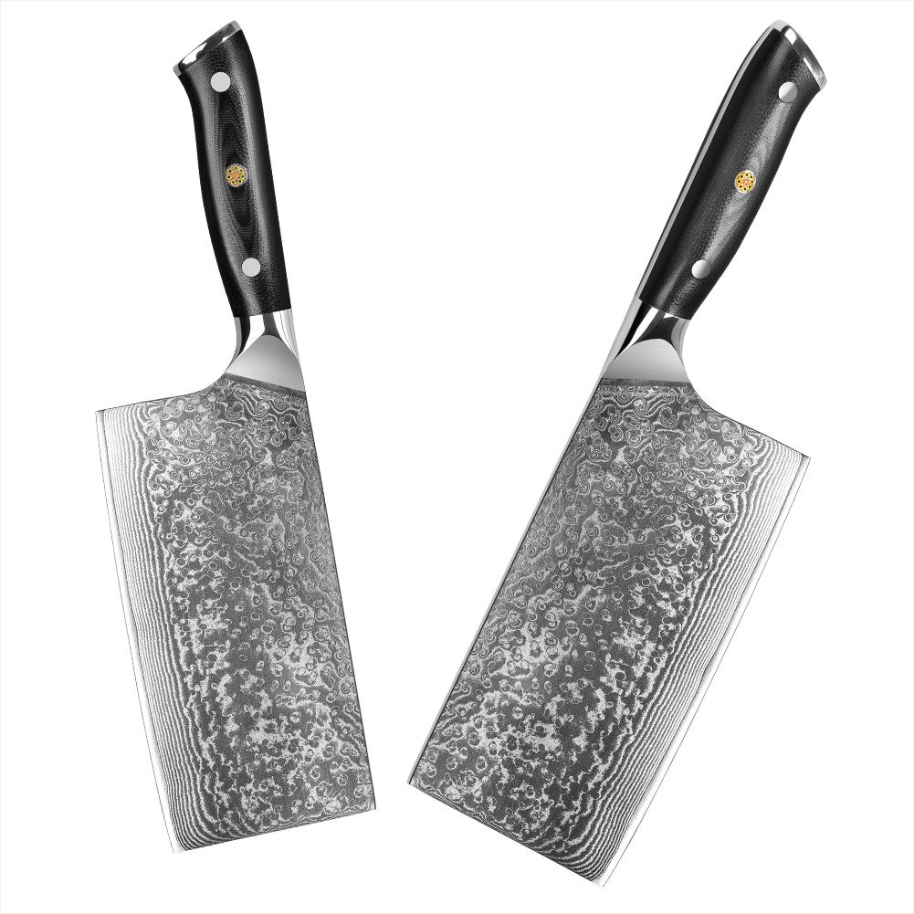 Modell: Hackmesser Gesamtlänge: 30.8 cm Klingenlänge: 17,5 cm Klingenbreite: 8.4 cm Gewicht: 394 g Härte der Schneidlage: 60±2 HRC Über das Chinesisches Küchenmesser Chinesische Küchenmesser werden hauptsächlich zum Schneiden von Fleisch und Gemüse verwendet. Wie der Name schon sagt, werden chinesische Fleischmesser zum Schneiden, Schneiden von Gemüse und Fleisch in Scheiben, sowie zum Hacken, Zerkleinern und Würfeln verwendet. Damast Chinesische Fleischmesser mit Schönheit und Schärfe • Auf den ersten Blick werden Sie von dem einzigartigen Muster des Griffs und dem guten Griffgefühl beeindruckt sein. • Bald werden Sie das angenehm scharfe Schnitterlebnis: schnelle Essensfreigabe, praktisch für alle Arten von Lebensmitteln, Müheloser und effizienter bei der Arbeit, usw. • Nach einigen Monaten werden Sie sich daran gewöhnen und das Damast Santokumesser wird in einem hervorragenden, neuwertigen Zustand bleiben. 67 Lagen Damaszener Stahl Klingen Mit dem VG-10-Kern ist die Klinge unglaublich stark und stabil. Hochleistungsfähiger, gegossener 67-lagiger Damaszenerstahl mit einer 2 mm Klinge und die Kanten sind mit 15 Grad pro Seite geschärft., die die Kanten scharf hält und gegen Flecken und Rost resistent ist. Ergonomischer G10-Griff Ergonomischer Griff aus japanische G10 haben korrosionsbeständig und verschleißfest. Um sicherzustellen, dass das Küchenmesser gut ausbalanciert ist und sich nicht lockert, nimmt der Griff des Kochmessers ein Full-Tang Design an. Um Ermüdung, Taubheit oder Schmerzen der Finger nach längerem Halten zu minimieren. Verwendung für Damaststahl Messer haben eine höhere Schärfe, Zähigkeit und Rostbeständigkeit und sind Multifunktionsmesser, die in jeder Küche benötigt werden. Die robuste Klinge mit scharfer Spitze ist ideal für die mühelose Handhabung verschiedener Fleisch- und Fischsorten, zum Schneiden, Schälen, Entbeinen und für alle Arten von mühsamen Aufgaben. Exquisite Geschenkbox • Verpackt in exquisiter Geschenkbox • Zum Verschenken und Eigengebrauch geeignet