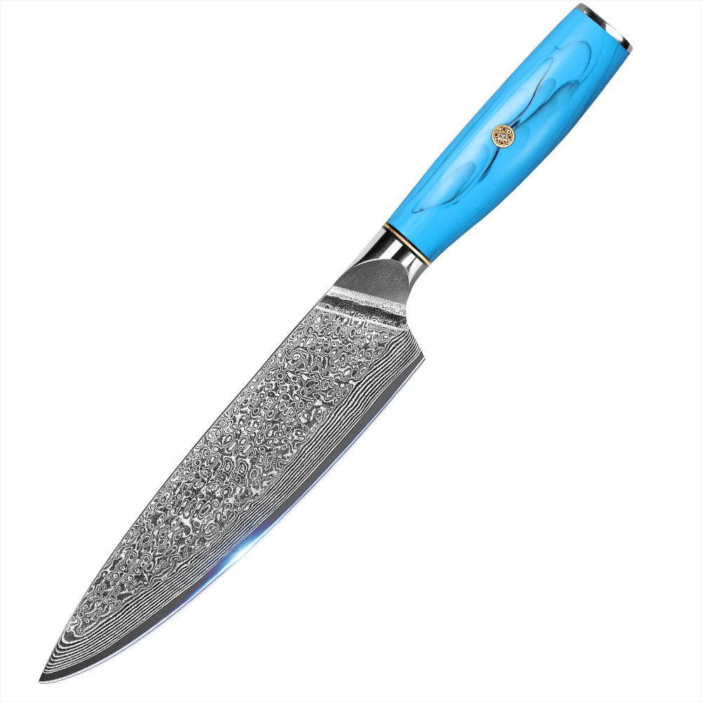 Uber das Damast Kochmesser aus VG10 Damaststahl mit Blau Harzgriff