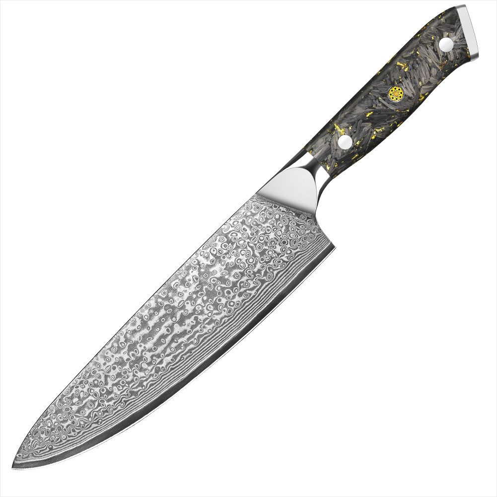 EINZIGARTIGER GRIFF: Der Griff des Messers ist aus Kohlefaser und Goldfolie in Acryl eingefasst! Jedes damaszener Küchenmesser ist ein echtes Unikat!