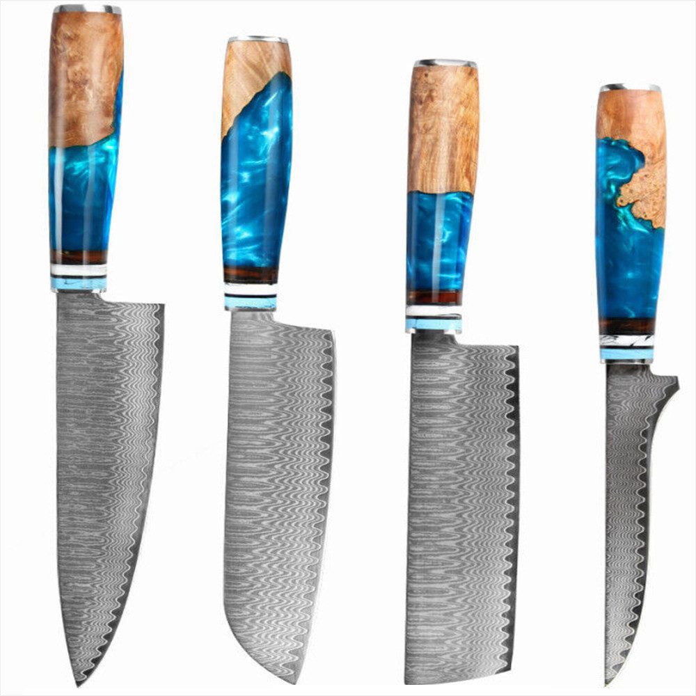 Klingenmaterial: Damaststahl 67 Schichten. Griffmaterial: Blaues Harzgriff.