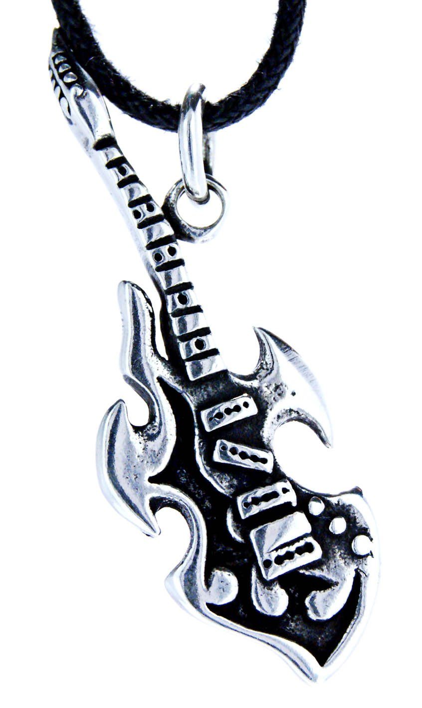 Der Kettenanhänger ist teilweise geschwärzt, sodass die Details des Instruments optimal zur Geltung kommen. Die Öse ist kunstvoll am Gitarrenhals befestigt.