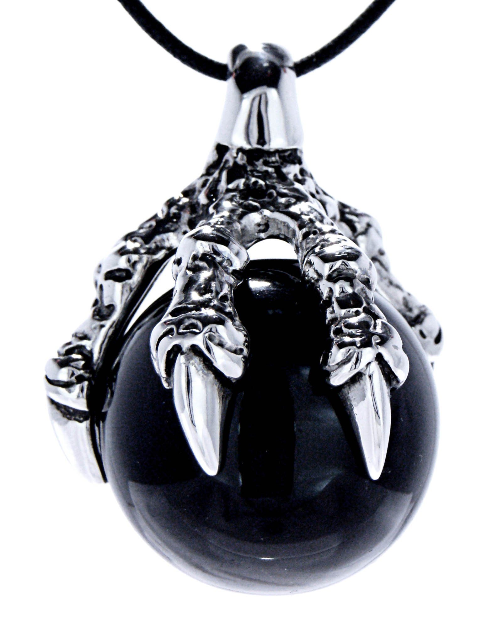 Massive, dreidimensionale Drachenkralle aus Edelstahl mit großer, schwarzer Kugel. Der Kettenanhänger ist teilweise geschwärzt.