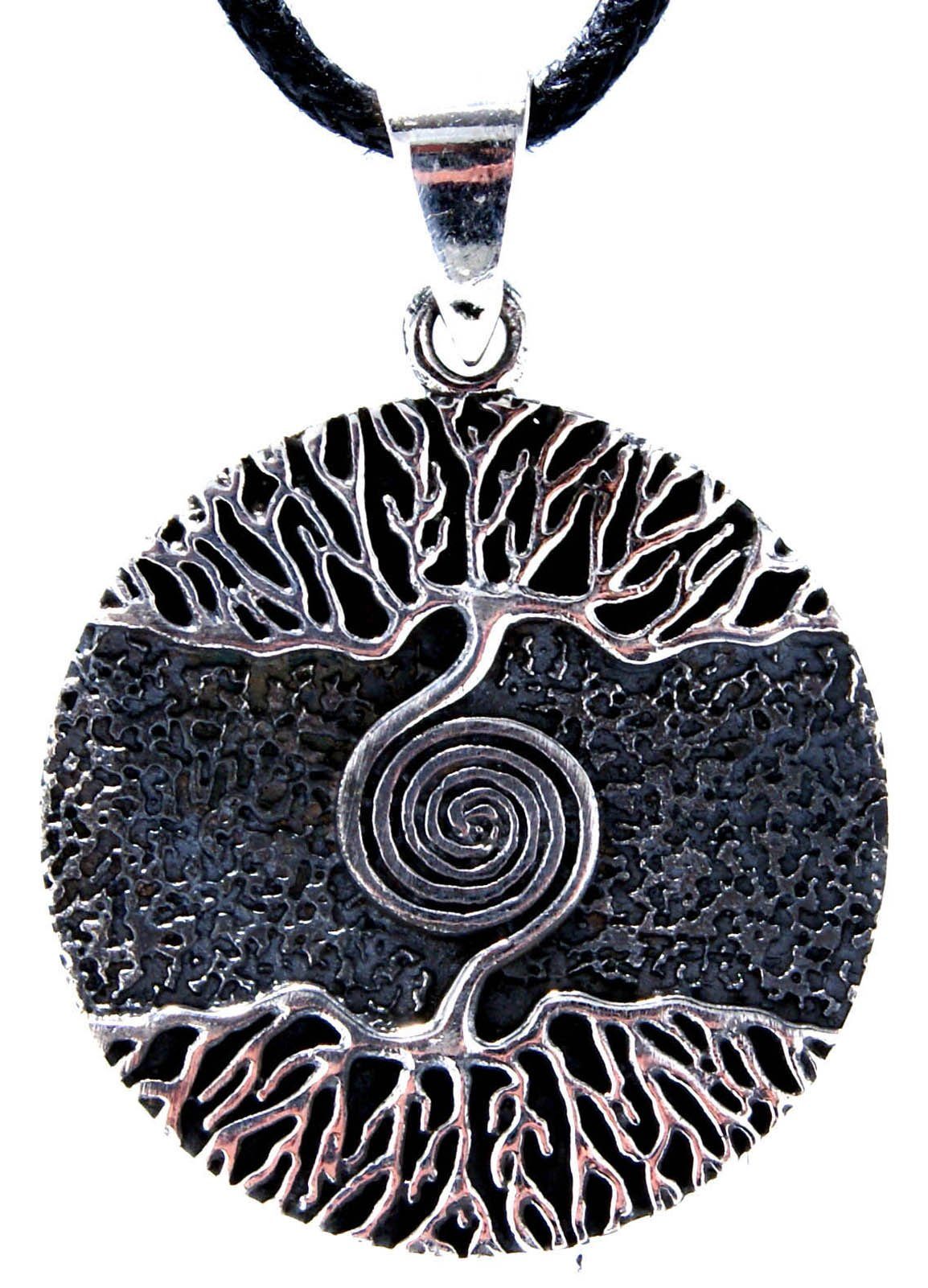 Kunstvoll gestaltete Kombination aus Lebensbaum und Spirale aus 925 Sterling Silber.