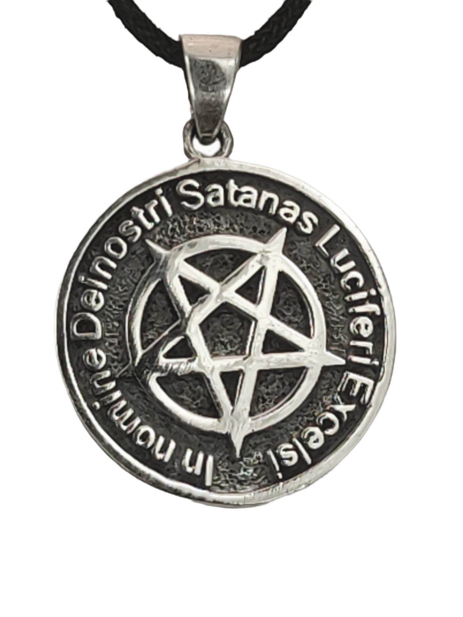 Kunstvoll gestaltetes Pentagramm aus 925 Sterling Silber. Das magische Symbol ist von einem Kreis mit den Worten " In Nomine Dei Nostri Satanas Luciferi Excelsi" umgeben.
