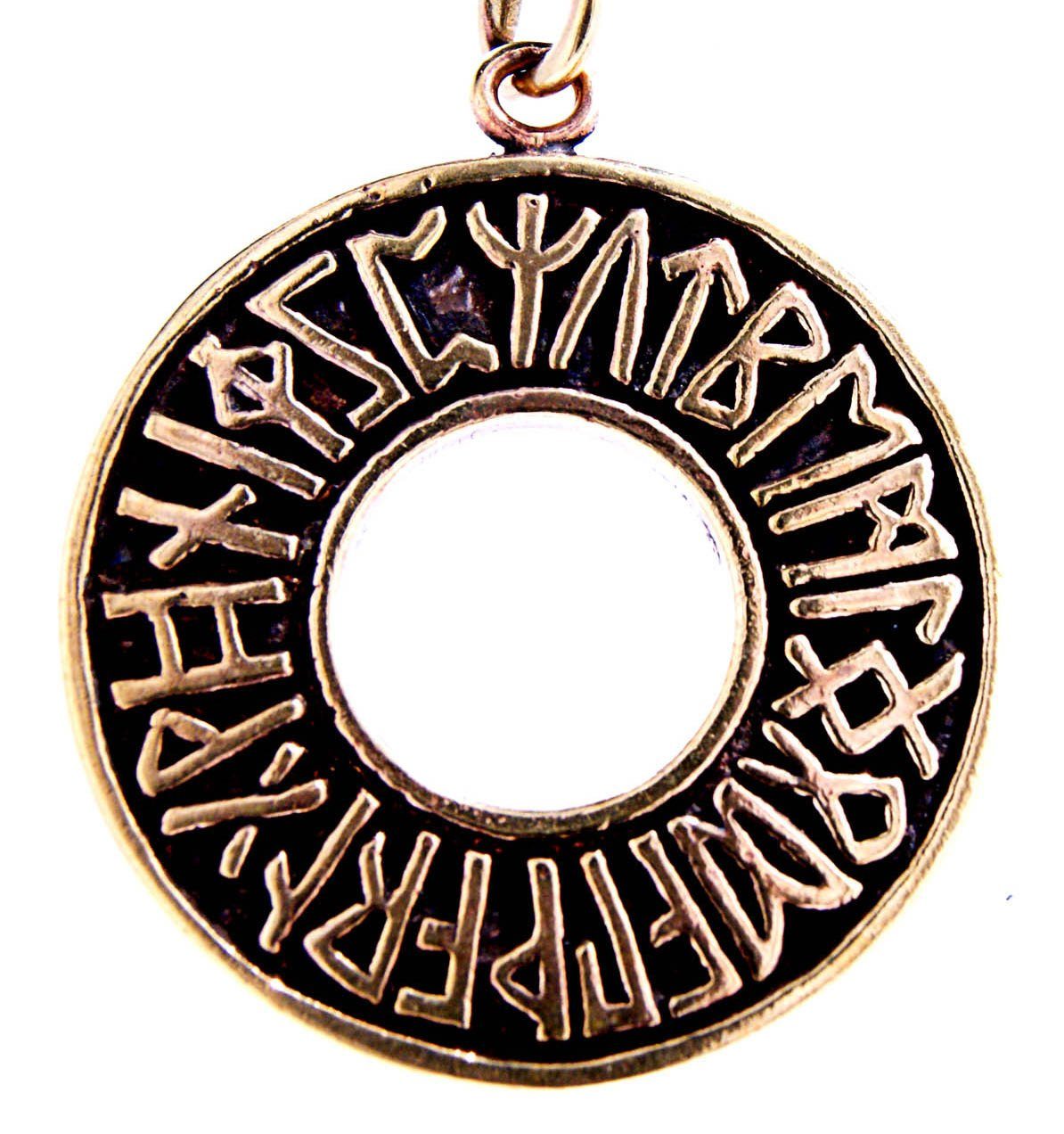 Großer, massiver, kunstvoll gestalteter Runenkreis aus Bronze. Die Schrift auf dem Kettenanhänger stellt das altgermanische Futhark (Runenalphabet) dar.
