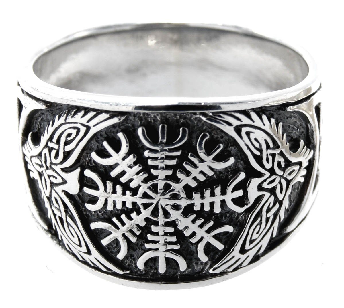 Der Ring ist mit dem isländischen Helm der Ehrfurcht, zwei Raben und Keltenknoten verziert.