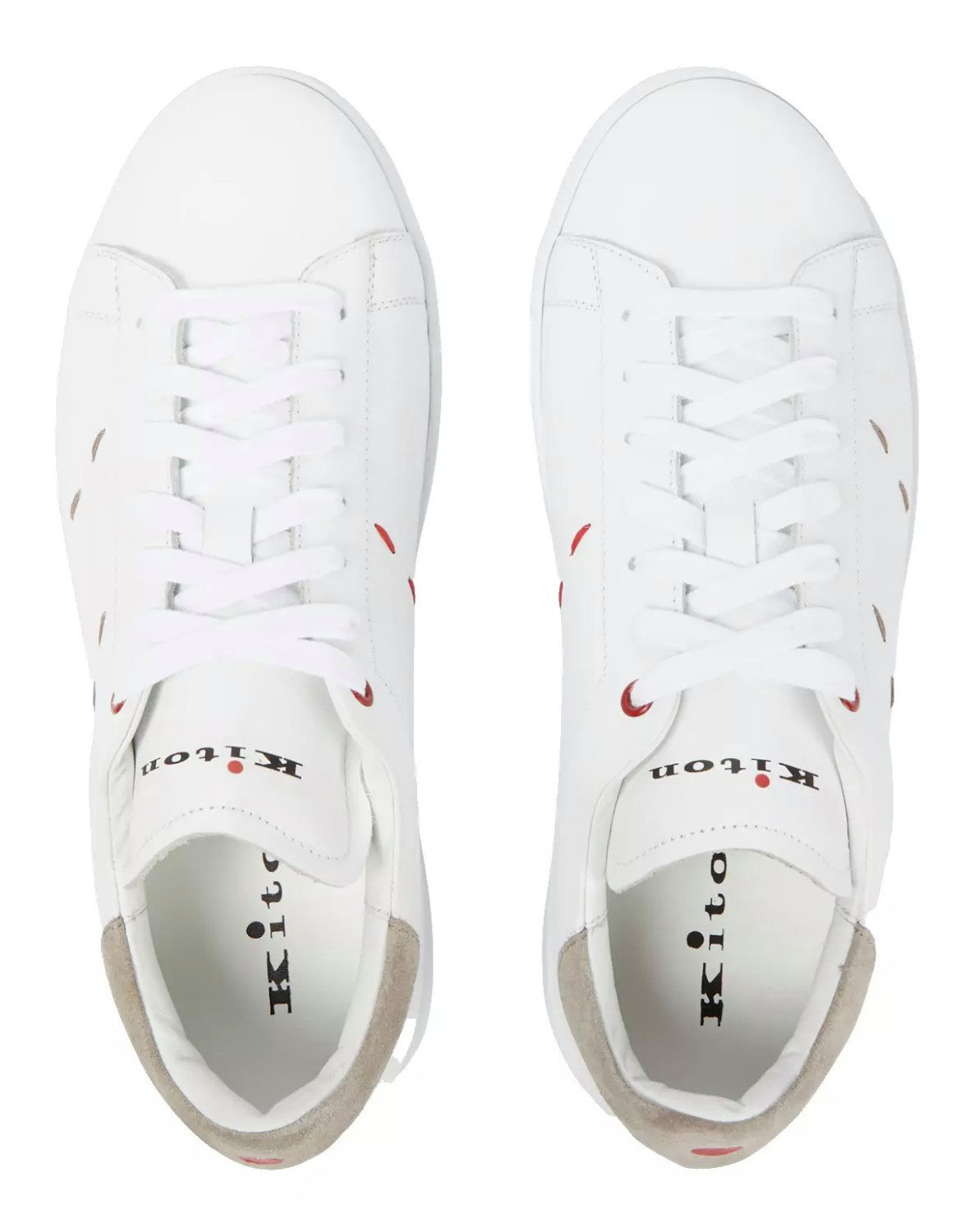 Diese eleganten, tief geschnittenen Sneakers von Kiton präsentieren sich in einem klaren, weißen Farbton und zeichnen sich durch markante, kontrastreiche rote Nähte an den Seiten aus. Gefertigt aus glattem Kalbsleder und ergänzt durch ein Branding auf der Zunge und eine Fersenkappe aus weichem Wildleder, sind diese Schuhe sowohl stilvoll als auch komfortabel. Die Sneakers sind in Italien handgefertigt und bieten mit ihrer runden Spitze und der flachen Gummisohle einen zeitlosen Look.