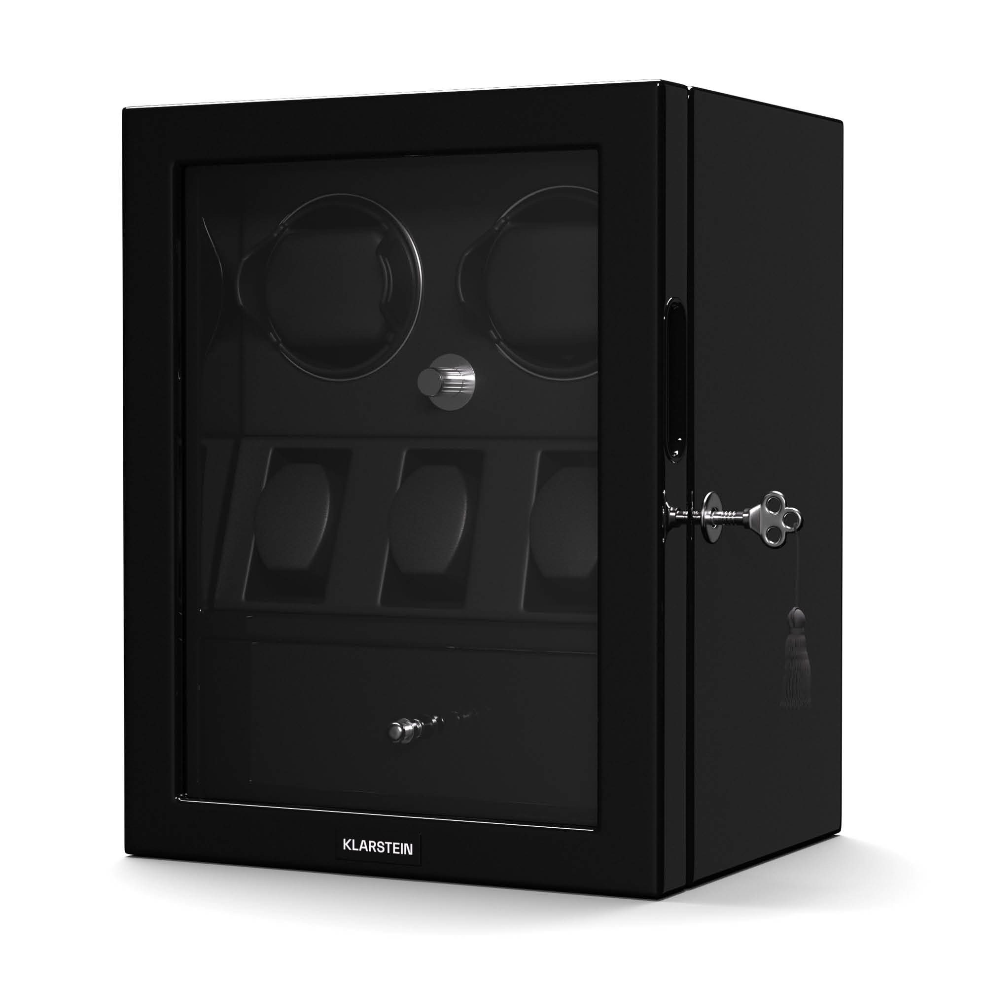 Der ChronoVault Uhrenbeweger von Klarstein besticht durch seine Hochglanzlackierung und die Innenverkleidung aus veganem Leder, die ihm ein elegantes Aussehen verleihen. Der extrem leise japanische Motor sorgt dafür, dass Ihre Uhren jederzeit leise und effizient aufgezogen werden. Mit vier verschiedenen Rotationsmodi und drei Richtungsoptionen bietet der ChronoVault die Flexibilität, die für die meisten mechanischen Uhren erforderlich ist. In der integrierten Schublade mit herausnehmbaren Trennwänden lassen sich Schmuck und anderes Zubehör komfortabel verstauen. Weiße LEDs beleuchten Ihre Uhren und verleihen dem ChronoVault eine edle Ausstrahlung.