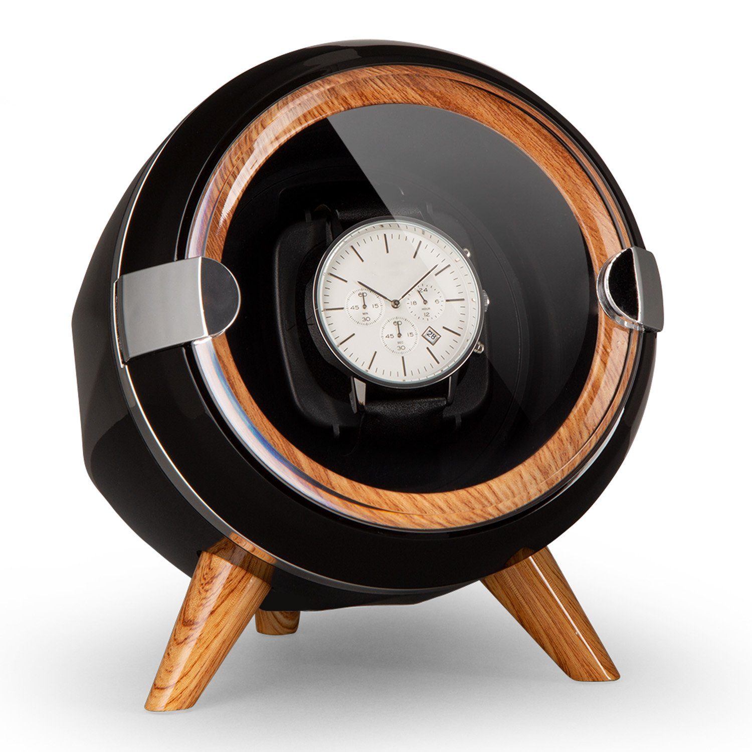Als Uhrenaufnahme dient ein edles schwarzes Samtkissen, dass jede Uhr elegant in Szene setzt. Auch Uhren mit einem langem Band finden festen Sitz durch eine aufsteckbare Erweiterung. Eine Klarsichtabdeckung schützt den wertvollen Chronometer vor Staub und Schmutz. Zur Rotation der Uhr stehen vier Modi zur Auswahl, die sie mit unterschiedlichen Intervallen entweder links- oder rechtsherum oder in wechselnder Drehrichtung in Bewegung halten. Insgesamt kann die Uhr entweder mit 650, 900, 1200 oder 1500 Umdrehungen pro Tag rotiert werden.