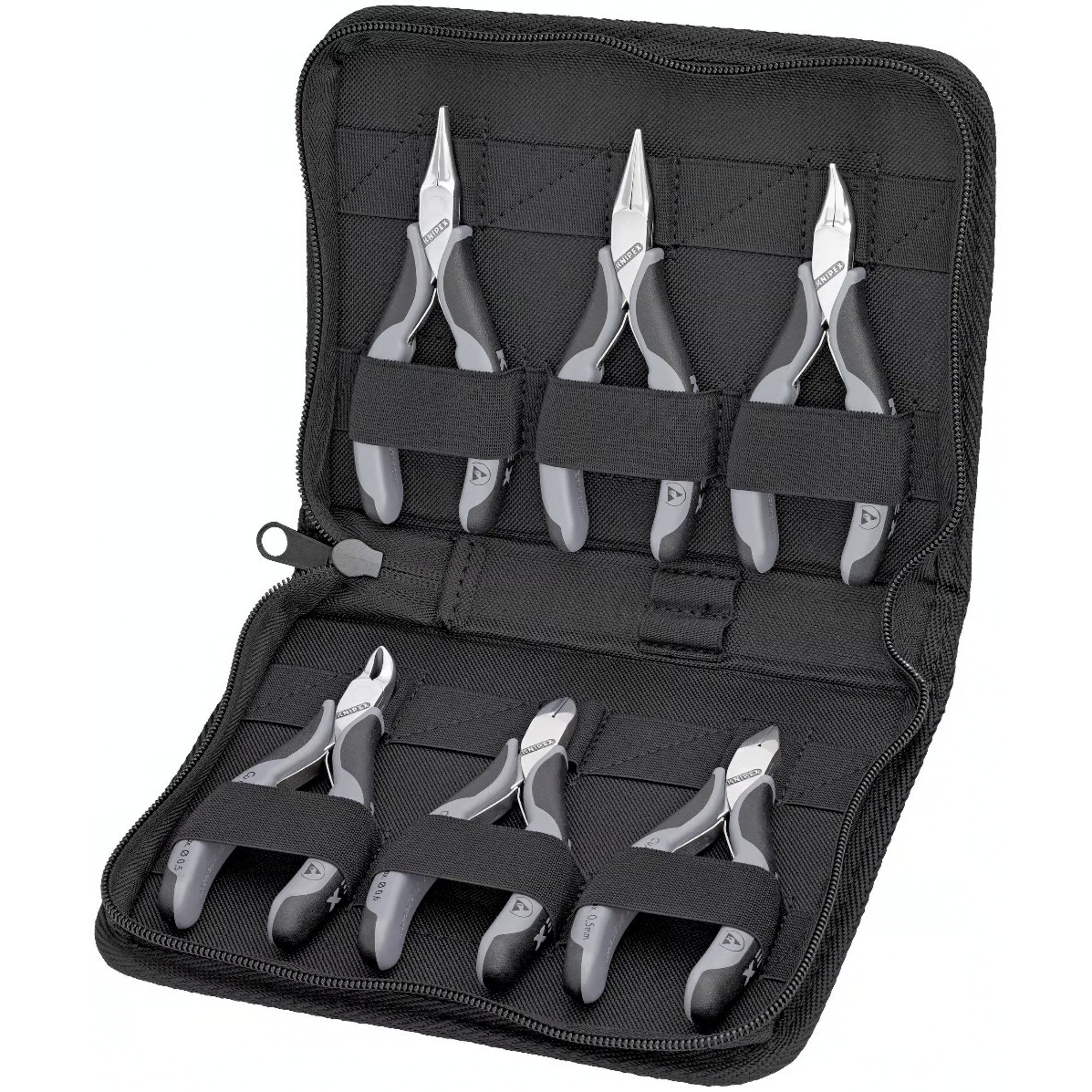 Ausführung ESD, elektrisch ableitend Das Elektronikzangen-Set 00 20 17 von KNIPEX enthält drei Elektronik-Greifzangen mit Öffnungsfeder (flach, flachrund und flachrund abgewinkelt), zwei Elektronik-Seitenschneider mit Öffnungsfeder (1x runder Kopf, 1x spitzer Kopf, Schneidenhärte 62 HRC) und einen Elektronik-Vornschrägschneider mit Öffnungsfeder (15° abgewinkelt, Schneidenhärte 56 HRC). Das Elektronikzangen-Set 00 20 16 wird in einem Etui aus strapazierfähigem Polyester-Gewebe geliefert, das sich ideal zur übersichtlichen und geschützten Aufbewahrung der Werkzeuge eignet. Die Zangenhalterungen bestehen aus elastischem Gummiband, das Etui ist mit einem Reißverschluss versehen. Plötzliche Entladungen infolge elektrostatischer Ladungsunterschiede sind speziell in der Elektronik gefürchtet. Bei den Elektronikzangen ESD wird die elektrostatische Energie gleichmäßig und kontrolliert über die leitfähigen Griffe kontinuierlich abgeleitet.