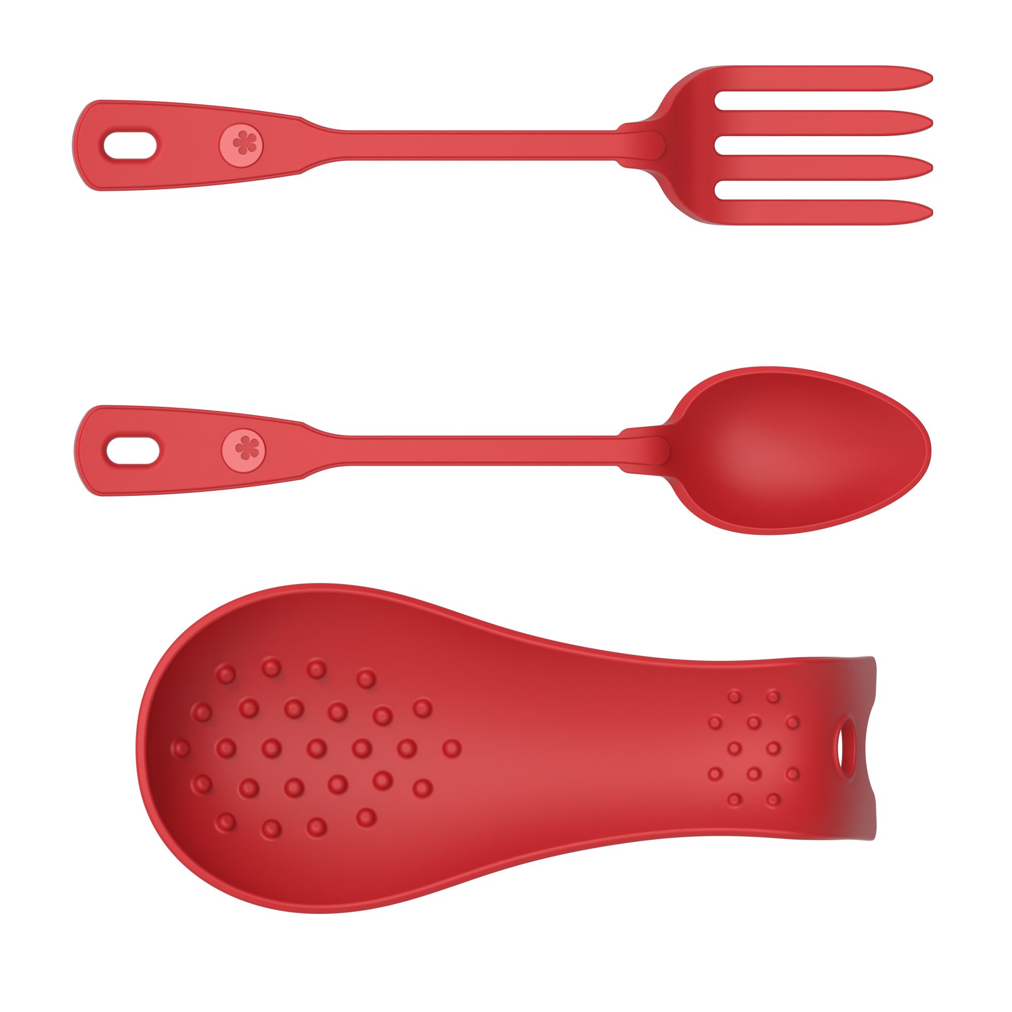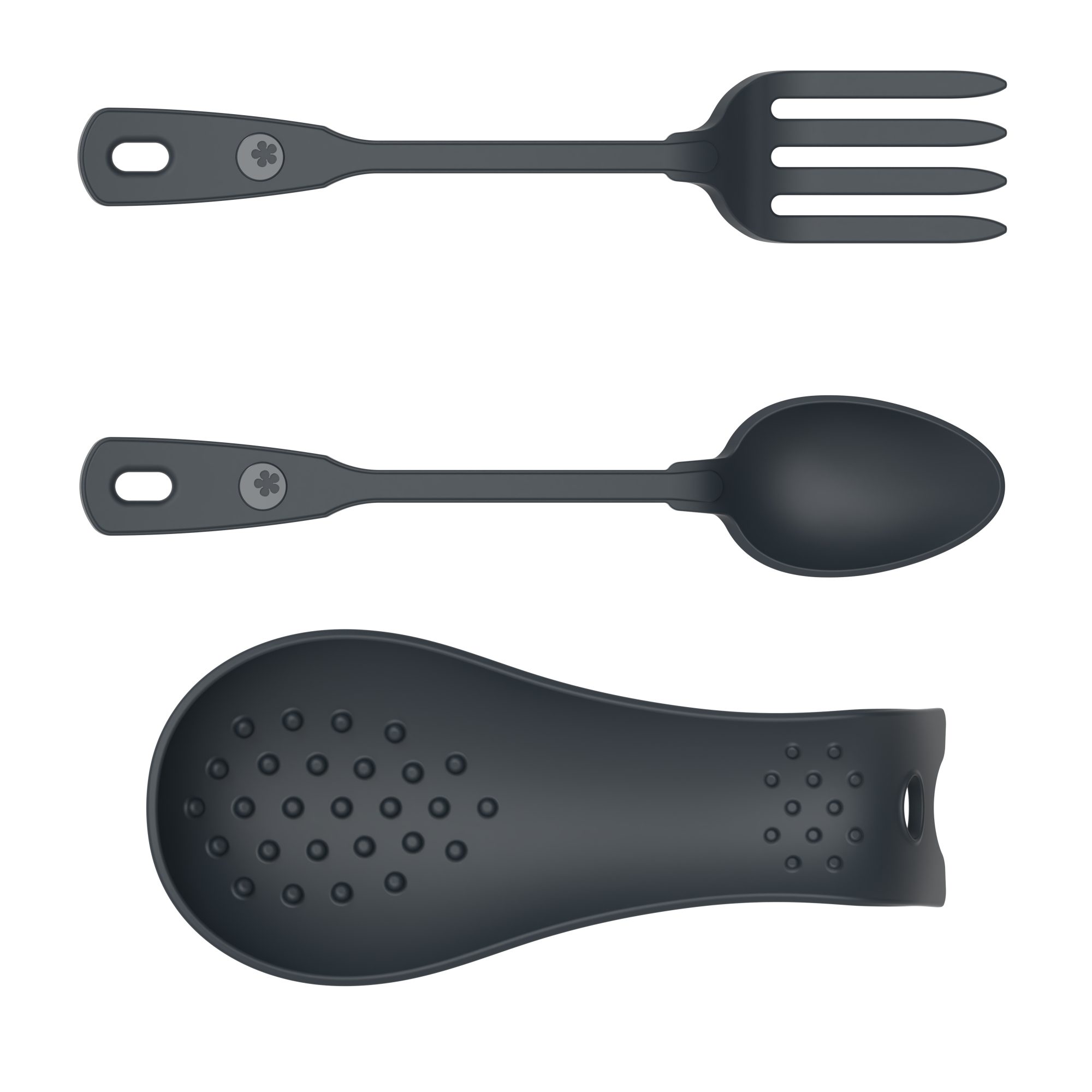 Die Löffelablage ist der ideale Helfer, wenn es um saubere Arbeitsflächen geht. Schmutziges oder fettiges Küchenzubehör kannst Du ganz einfach darauf ablegen und bei Bedarf wieder verwenden. Lebensmittelechtes Silikon und BPA-frei Hitzebeständigkeit bis 260°C Spülmaschinenfest Edelstahlkern Schont die Oberfläche von Töpfen, Pfannen und Schüsseln 3er Set