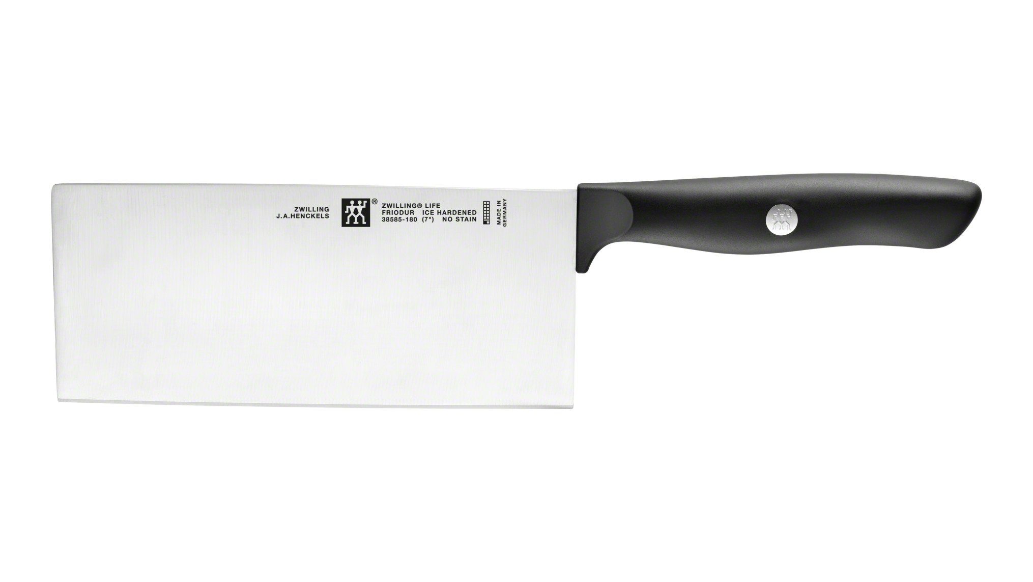 ZWILLING J.A. HENCKELS ZWILLING® Life Messer Chinesisches Kochmesser Hergestellt in Deutschland Die authentischen, unkomplizierten Gerichte der modernen und jungen Küche sind ganz nach Ihrem Geschmack? Dann erleben Sie, wie einfach und unkompliziert deren Zubereitung mit den ZWILLING Life Messern gelingt. Dieses Chinesische Kochmesser mit einer Klingenlänge von 180 mm ist ein präzises und funktionales Werkzeug. Mit seiner traditionellen Form erweist es sich als besonders vielseitig, insbesondere bei der Zubereitung von Fleisch, Fisch und Gemüse. Auch für das asiatische Kochen ist es ideal geeignet. Die Klinge made in Solingen bietet eine herausragende Qualität, zu der Materialauswahl, Verarbeitung und Veredelung entscheidend beitragen. Verwendet wird ZWILLING Spezialstahl, der zuerst in einem modernen Применитьungsverfahren exakt in Form gebracht wird. Danach verleiht ihm die FRIODUR Eishärtung seine hohe Schnitthaltigkeit, Korrosionsbeständigkeit und Flexibilität. Diese besonderen Eigenschaften machen das Messer jeden Tag zu einem zuverlässigen und präzisen Helfer, der lange scharf bleibt. Die Vorteile des ergonomisch geformten Griffs liegen auf bzw. in der Hand: Sie profitieren von einer sicheren und ermüdungsfreien Handhabung. Um das moderne Design des Kunststoffgriffs zu unterstreichen, ist ein silberner Metallpin mit ZWILLING Logo eingelassen. Eher praktische Gründe hat hingegen die fugenlose Verarbeitung: Sie optimiert die Hygiene und erleichtert Ihnen die Reinigung. Chinesisches Kochmesser mit einer Klingenlänge von 180 mm Liegt perfekt und leicht in der Hand Klinge aus ZWILLING Spezialstahl, FRIODUR eisgehärtet Fugenloser, ergonomischer Griff Modernes Design Gefertigt in Solingen