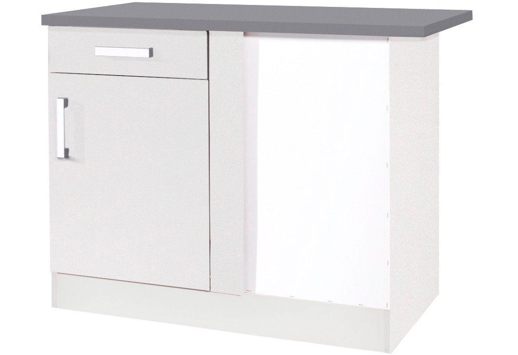 Die Küchenserie »KS-Toronto« mit ihren matten melaminbeschichteten Fronten sieht nicht nur toll aus, sondern birgt auch hinsichtlich der Platzausnutzung ein durchdachtes Konzept. So bietet der Eckunterschrank mit einer Tür und einem Auszug viel Stauraum. Der Küchenschrank hat silberfarbene Kunststoffgriffe und ist komplett wechselseitig montierbar.