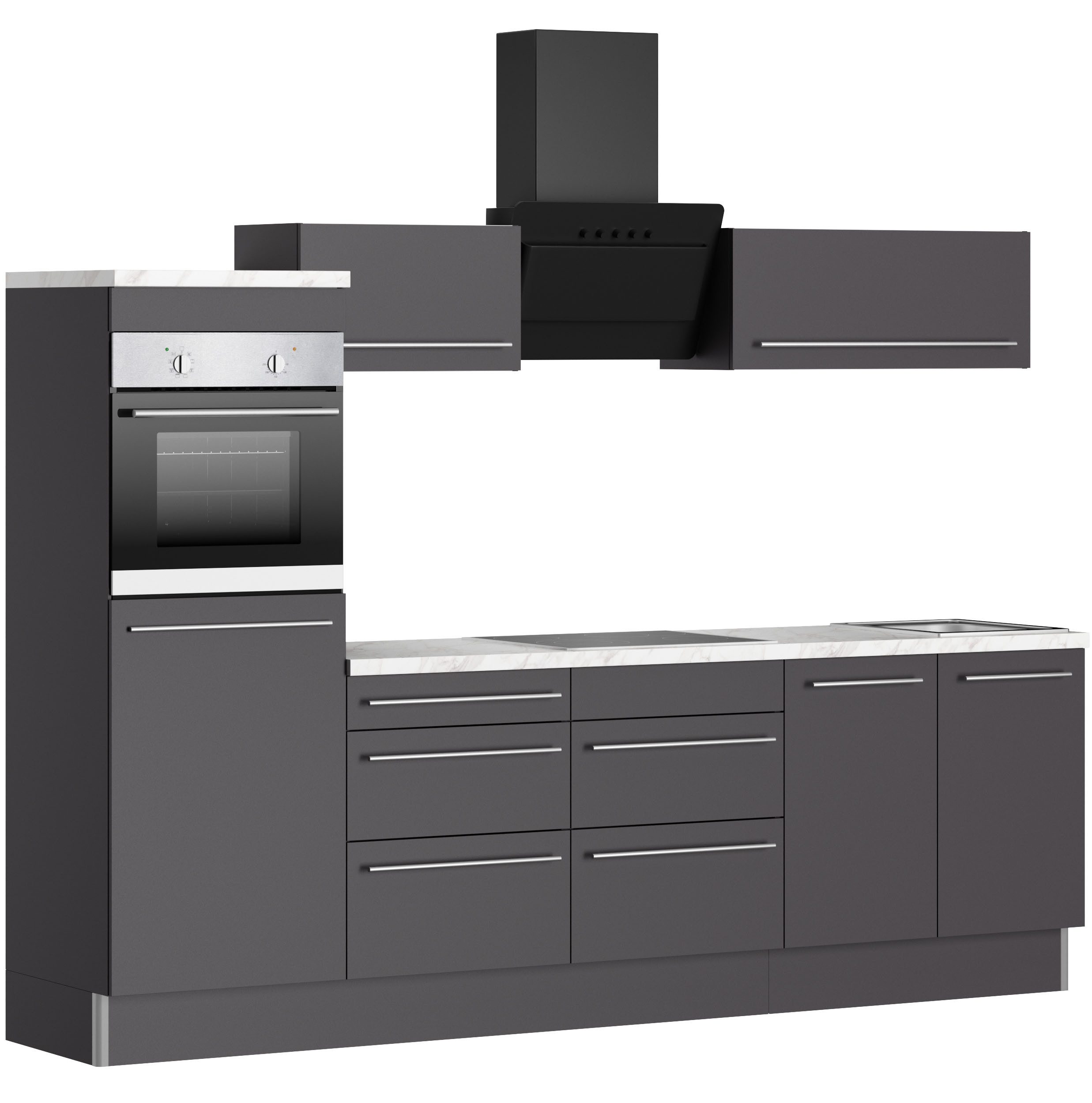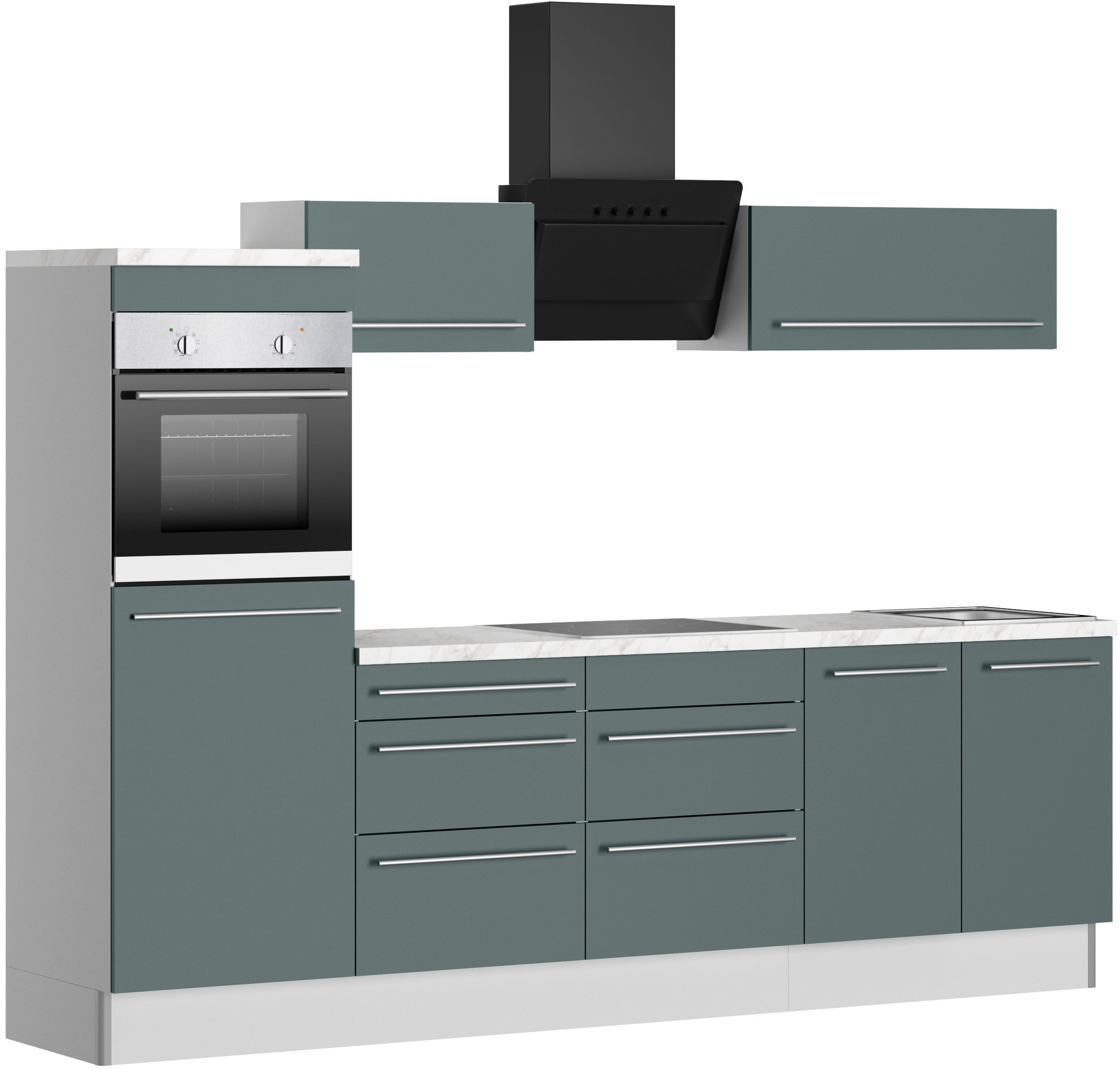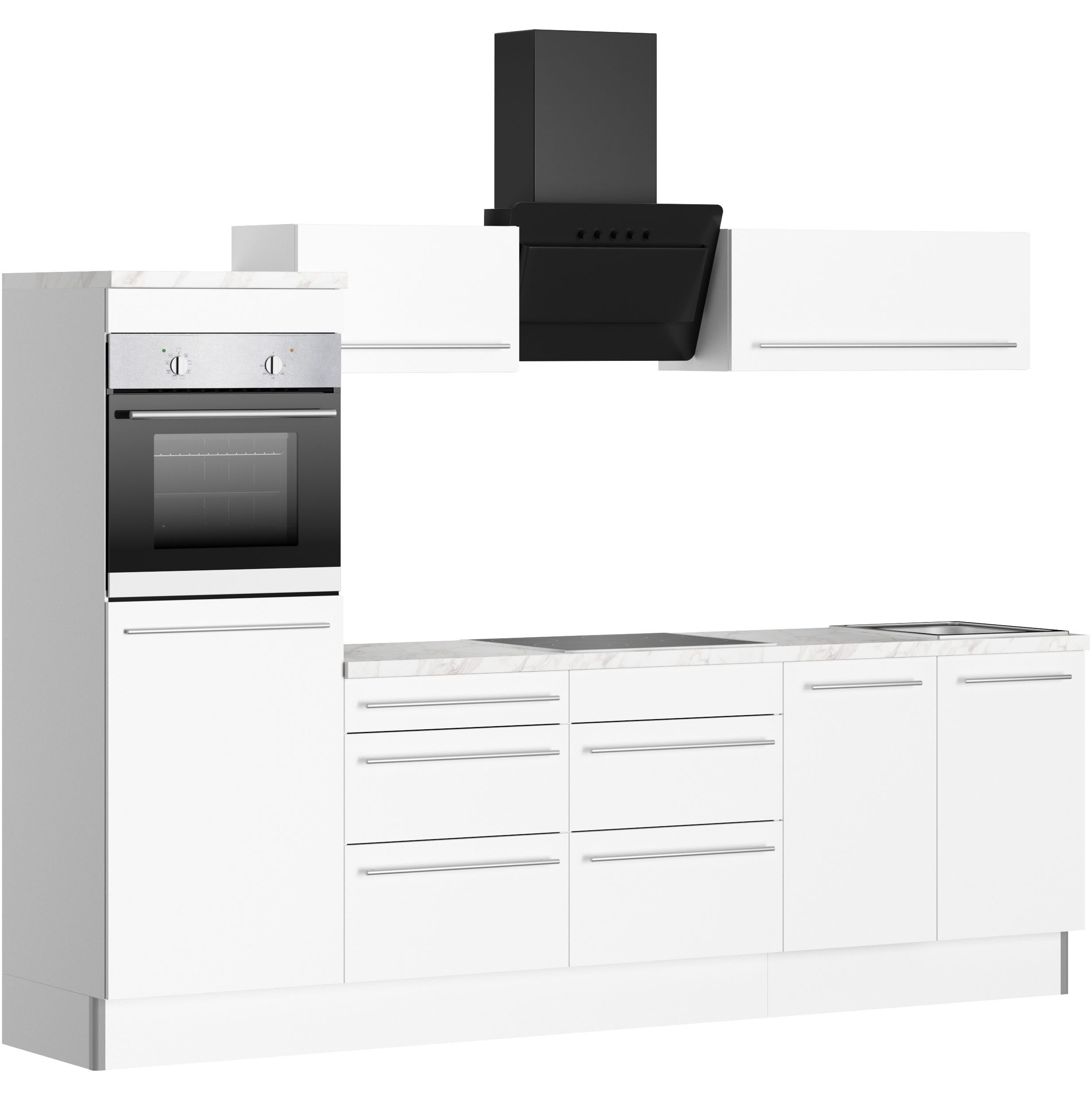 Ausstattung | Durchgehende Arbeitsplatte Einlegeböden höhenverstellbar Höhenverstellbare Füße Metallgriffe Seitenverkehrt stellbar Stabile Metallauszüge inkl. Edelstahl-Einbauspüle, ohne Abtropffläche |