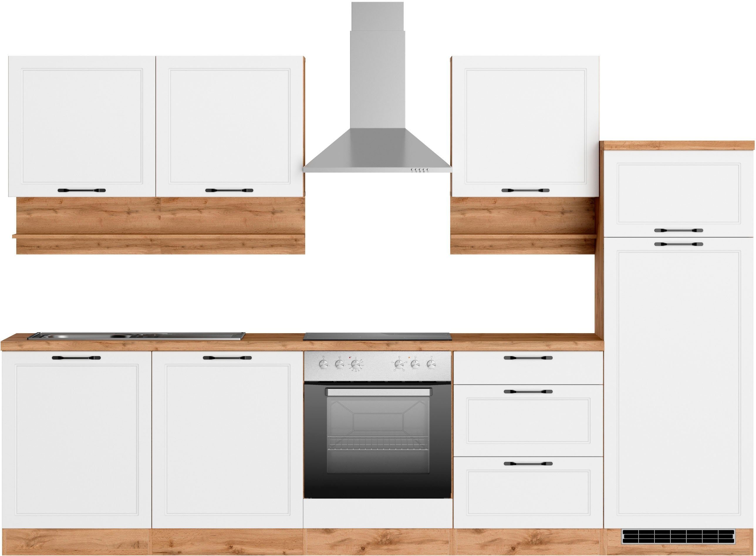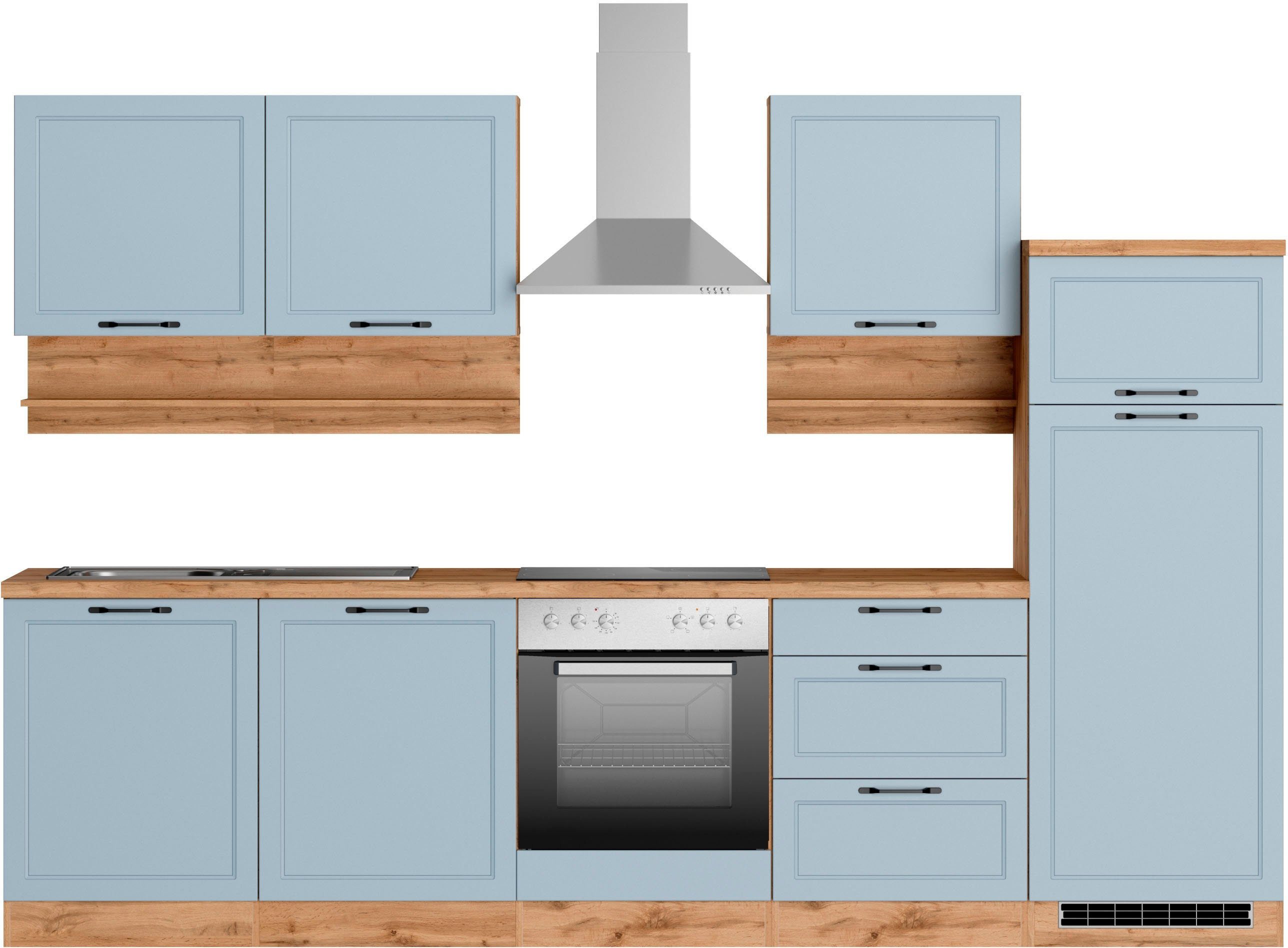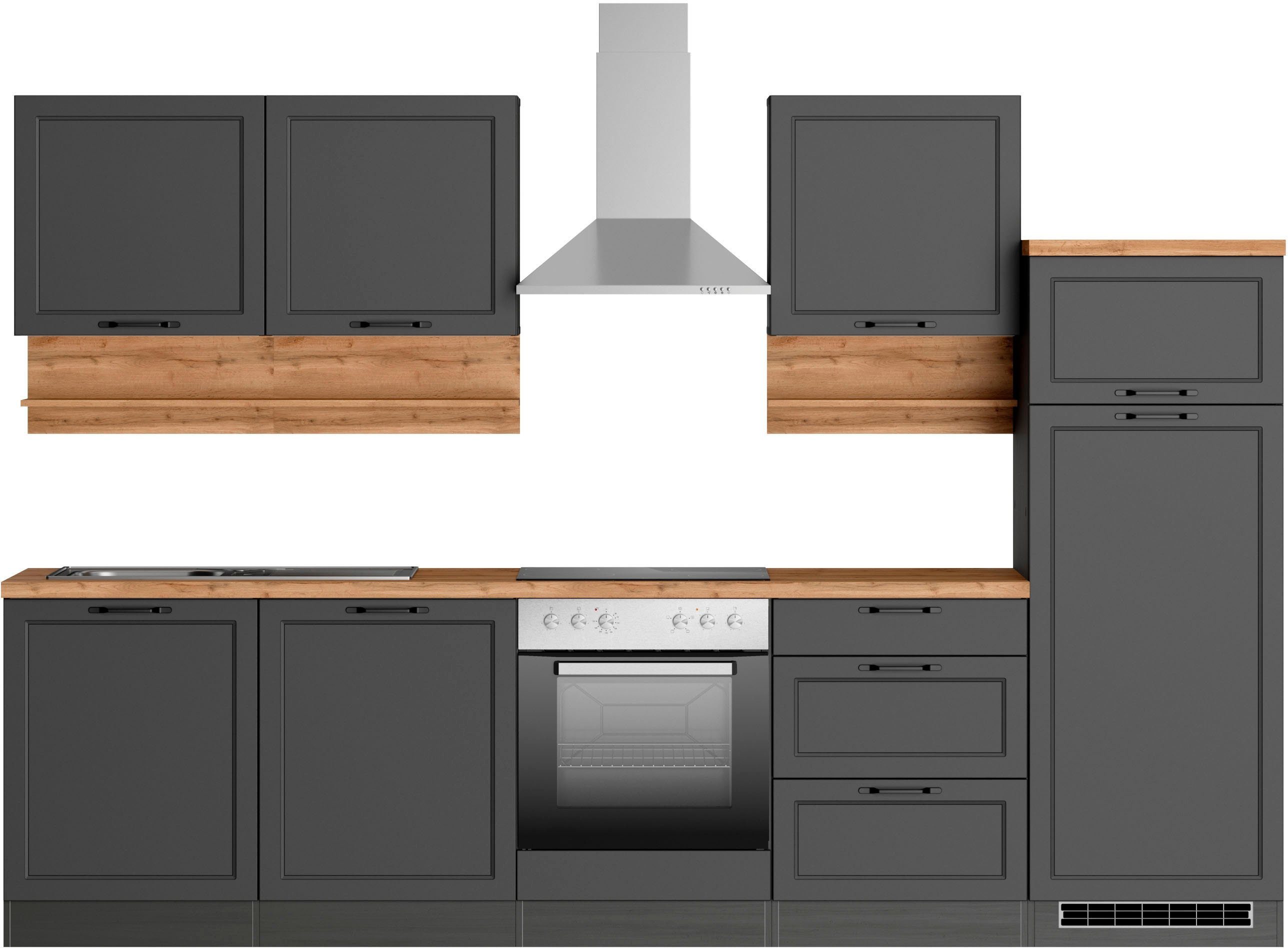 Ausstattung | Durchgehende Arbeitsplatte Einlegeböden höhenverstellbar Laufleisten der Schubkästen aus Metall Metallgriffe inkl. Edelstahl-Auflagespüle, mit Abtropffläche ohne E-Geräte |
